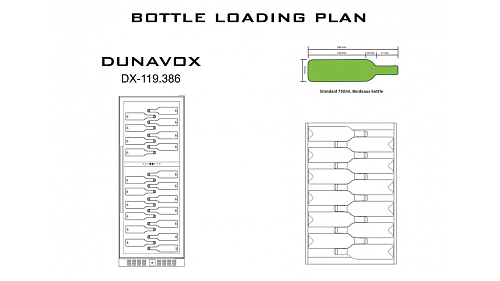 Шкаф винный Dunavox DX-119.386DB предназначен для демонстрации, хранения и создания оптимальных условий для сохранения всех вкусовых свойств вина в бутылках на предприятиях общественного питания, торговли, в барах, ресторанах, специализированных магазинах, частных домах или квартирах. Модель оснащена сенсорной панелью управления и LED-подсветкой синего цвета в каждой зоне. Корпус выполнен из окрашенного металла, дверь - из рамы черного цвета и тонированного стекла с защитой от ультрафиолетовых лучей, накладная ручка двери - из нержавеющей стали.