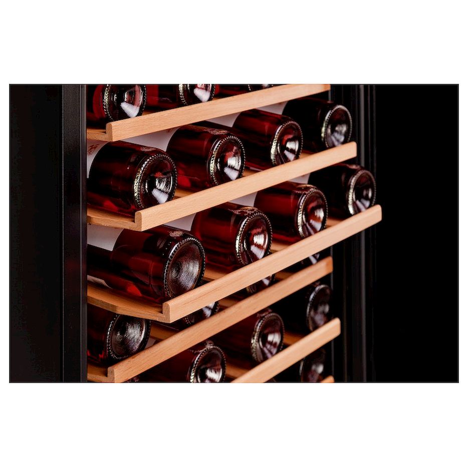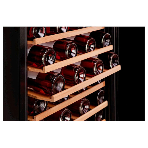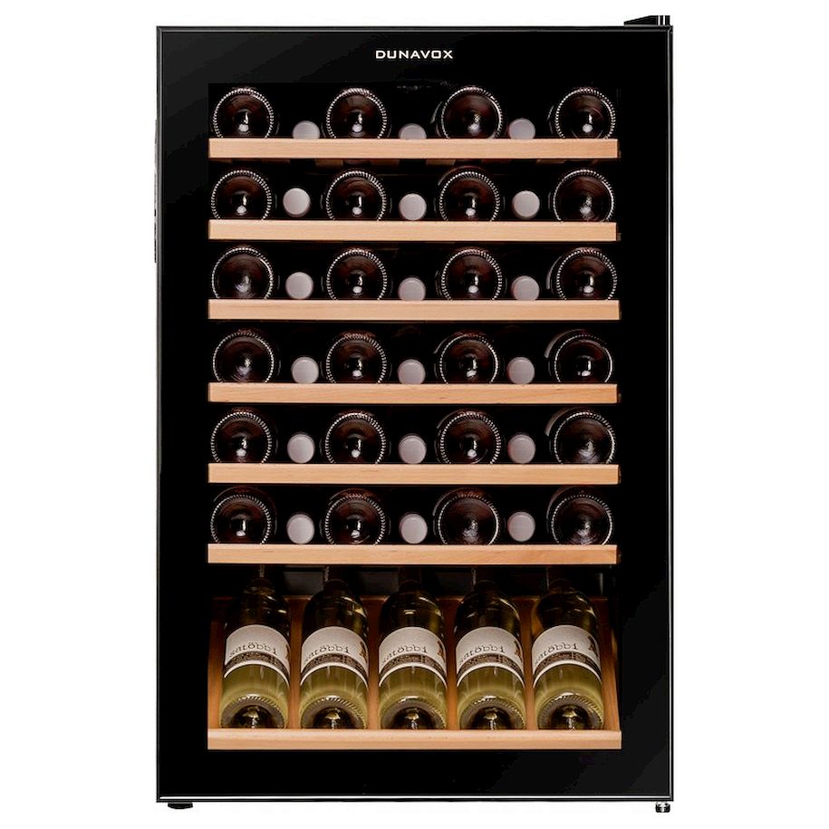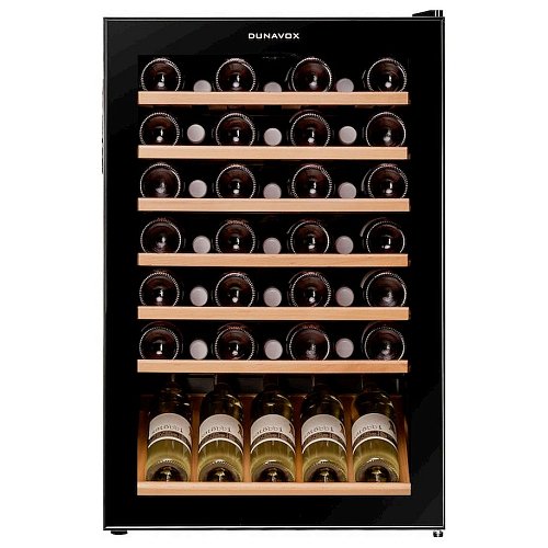 Шкаф винный Dunavox DX-48.130KF предназначен для демонстрации, хранения и создания оптимальных условий для сохранения всех вкусовых свойств вина в бутылках на предприятиях общественного питания, торговли, в барах, ресторанах, специализированных магазинах, частных домах или квартирах. Модель оснащена сенсорной панелью управления и LED-подсветкой синего цвета. Дверь выполнена из рамы черного цвета и тонированного стекла с защитой от ультрафиолетовых лучей, полки - из нелакированного бука, демонстрационная решетка - из хромированного металла.