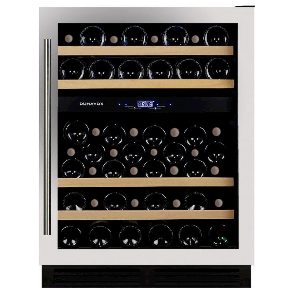 Шкаф винный Dunavox DX-53.130SDSK/DP используется для хранения разливного вина. LED-подсветка синего цвета.
