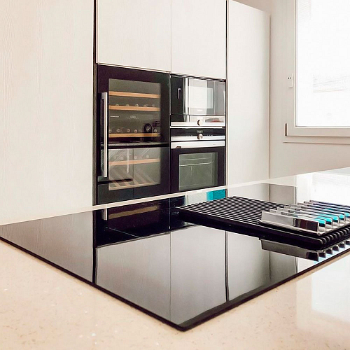 Модель оснащена сенсорной панелью управления и LED-подсветкой синего цвета в каждой зоне. Корпус выполнен из окрашенного металла, дверь - из рамы черного цвета и тонированного стекла с защитой от ультрафиолетовых лучей, полки - из нелакированного бука, накладная ручка двери - из нержавеющей стали.