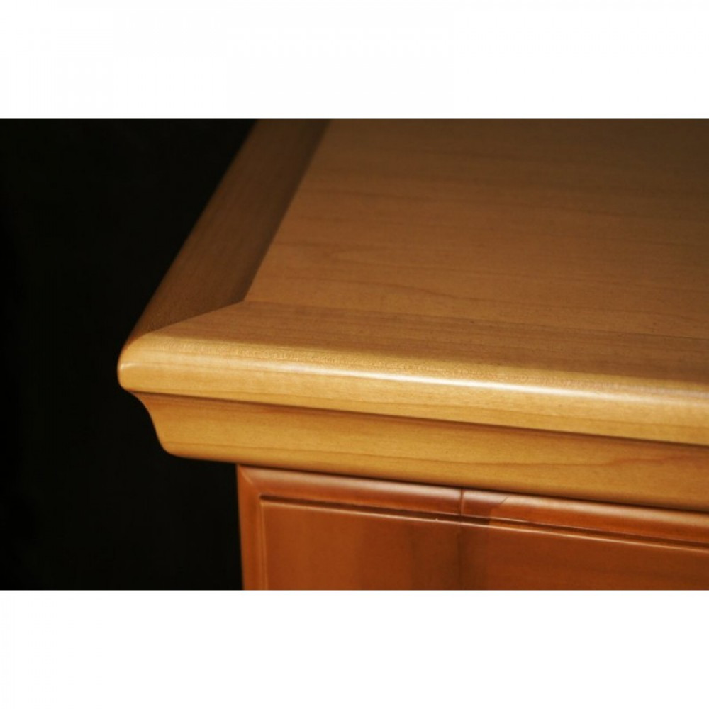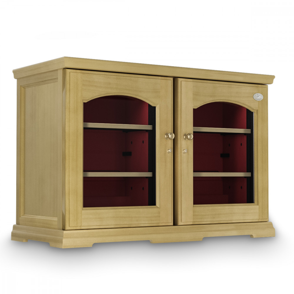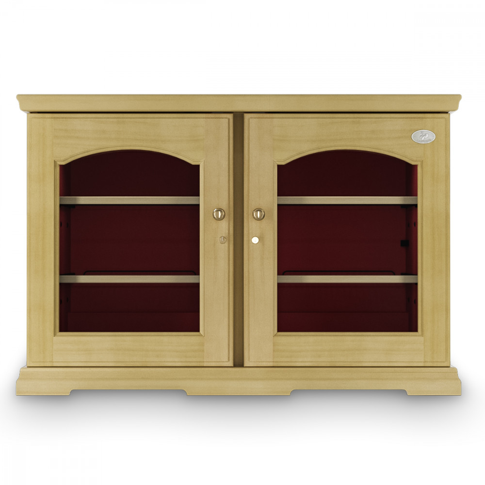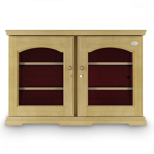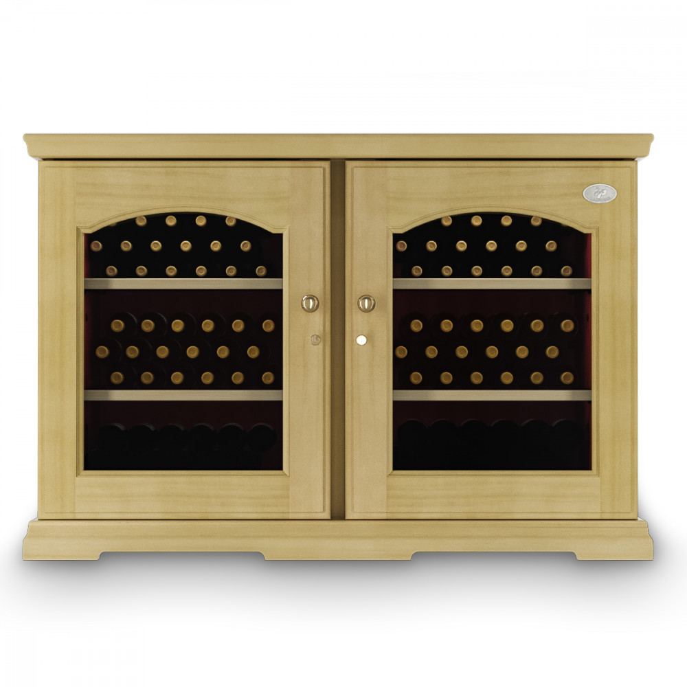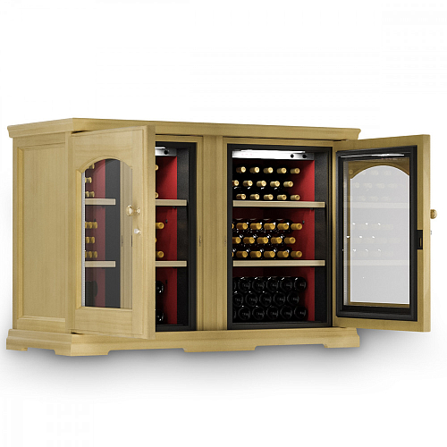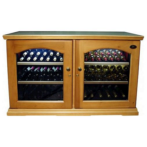 Модель оснащена электронным термостатом, цифровым дисплеем, подсветкой и замком. Корпус выполнен из крашенного металла, встроенного в деревянный короб, двери - из двойного стекла с защитой от ультрафиолетовых лучей, полки - из крашенного металла.