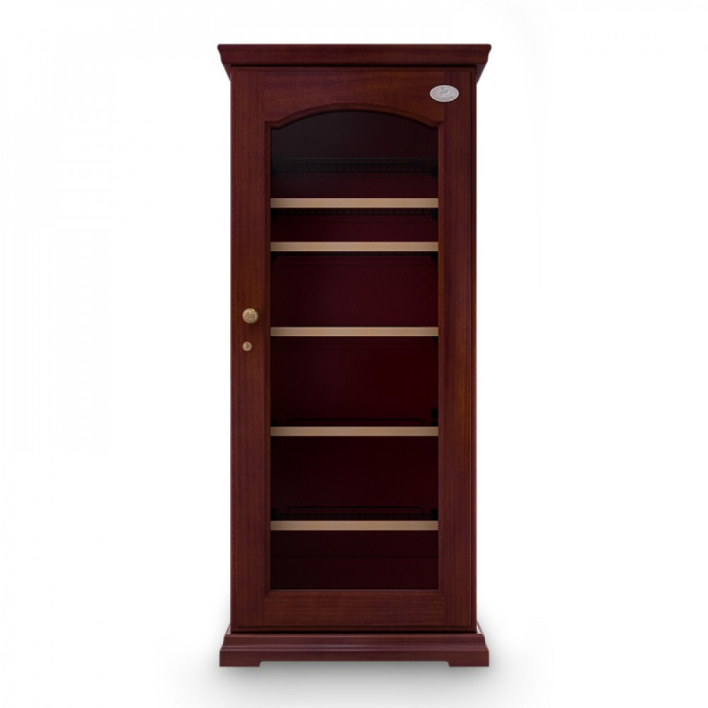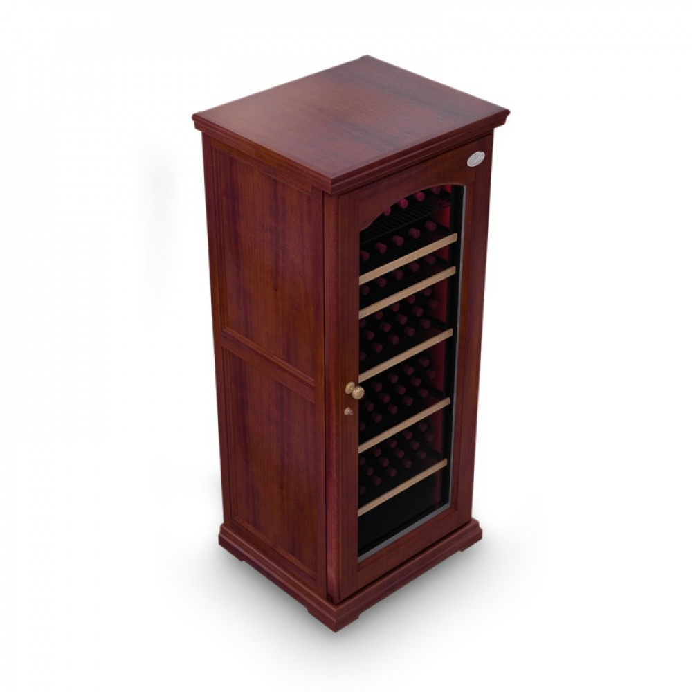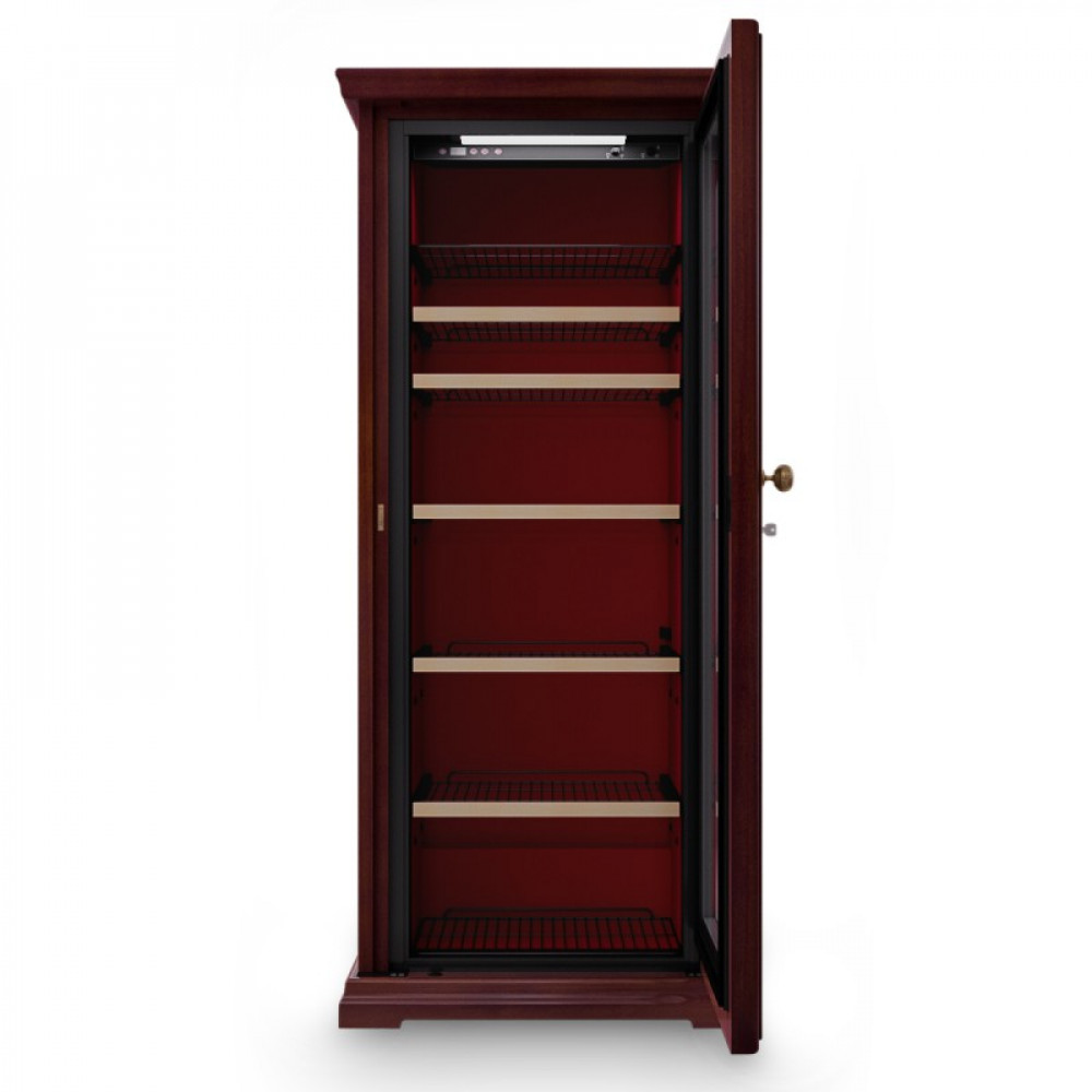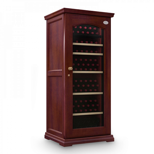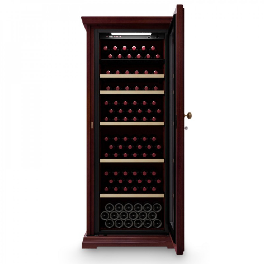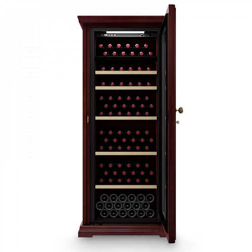 Корпус холодильника металлический, внешняя отделка винного шкафа выполнена из древесины Risto Line в четырех цветовых решениях. Дверца выполнена из двойного тонированного стеклопакета с защитой от уф лучей, имеет встроенный замок и удобную ручку в классическом стиле.