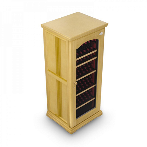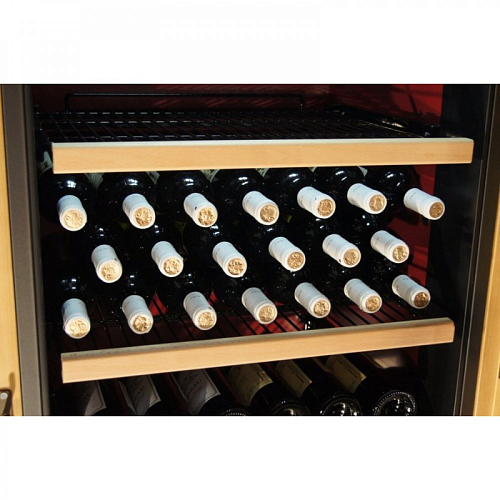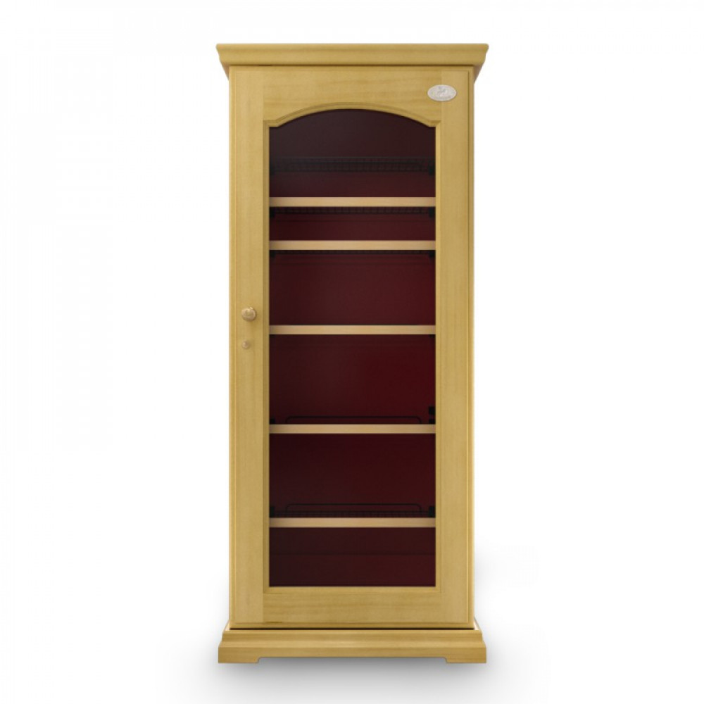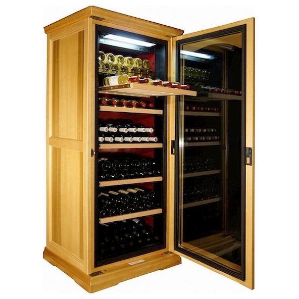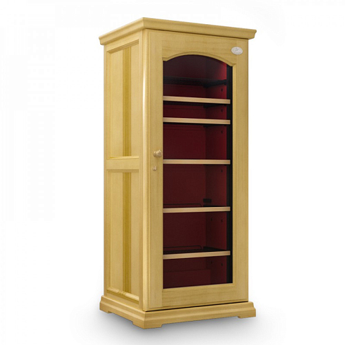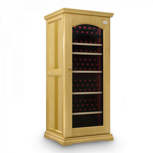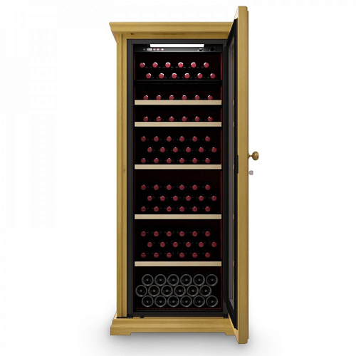 Модель оснащена электронным термостатом, цифровым дисплеем, подсветкой и замком. Корпус выполнен из крашенного металла, встроенного в деревянный короб, дверь - из двойного стекла с защитой от ультрафиолетовых лучей, полки - из крашенного металла.