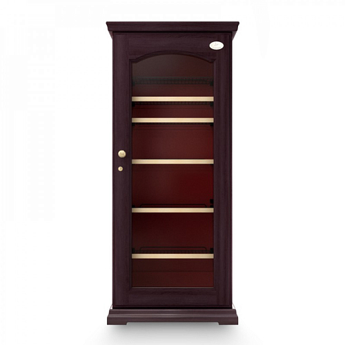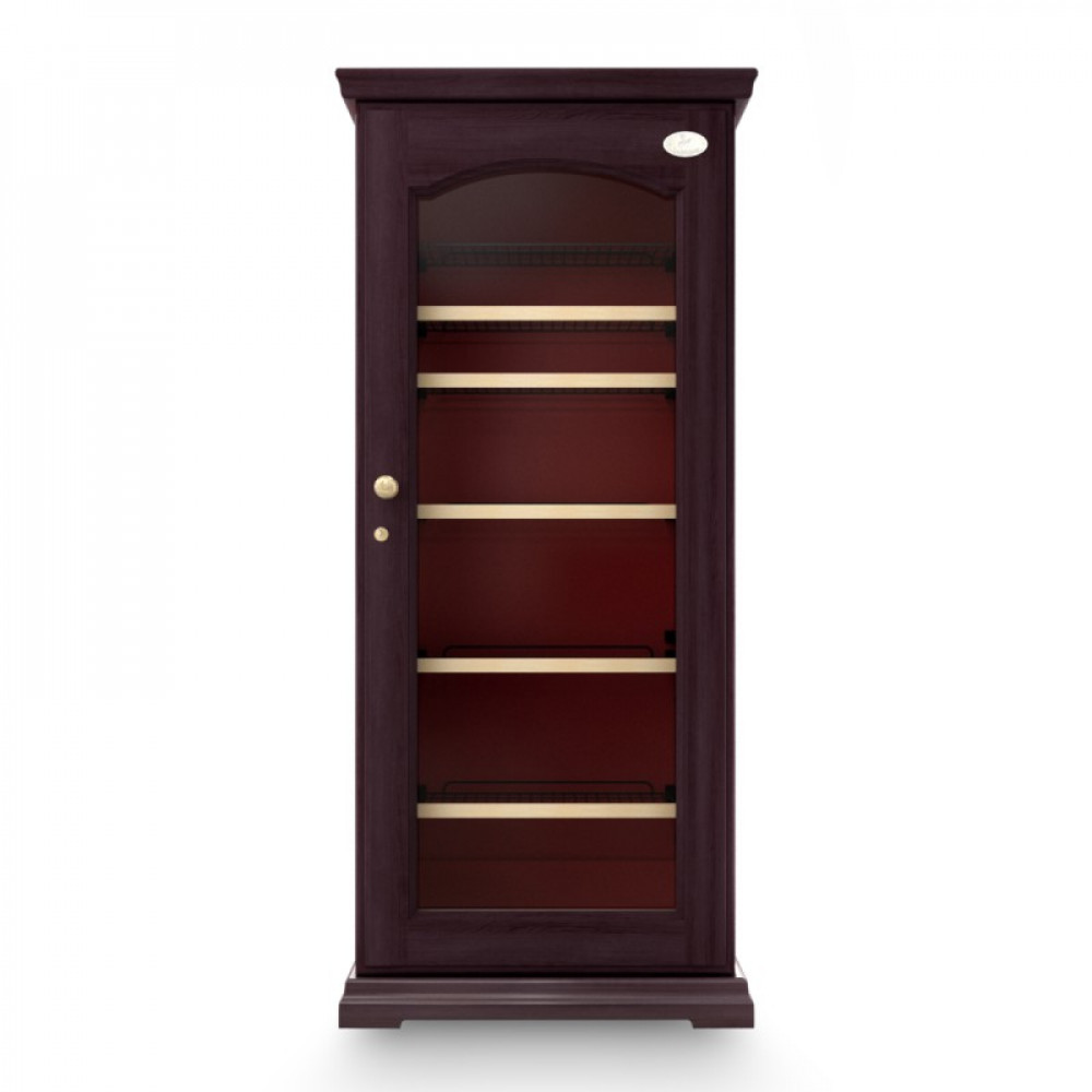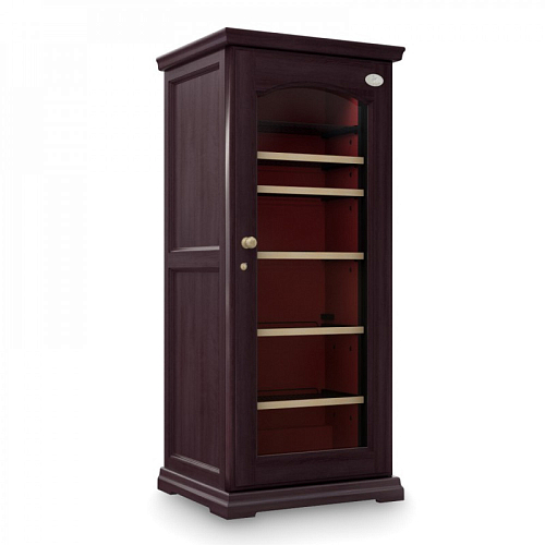 Модель оснащена электронным термостатом, цифровым дисплеем, подсветкой и замком. Корпус выполнен из крашенного металла, встроенного в деревянный короб, дверь - из двойного стекла с защитой от ультрафиолетовых лучей, полки - из крашенного металла.