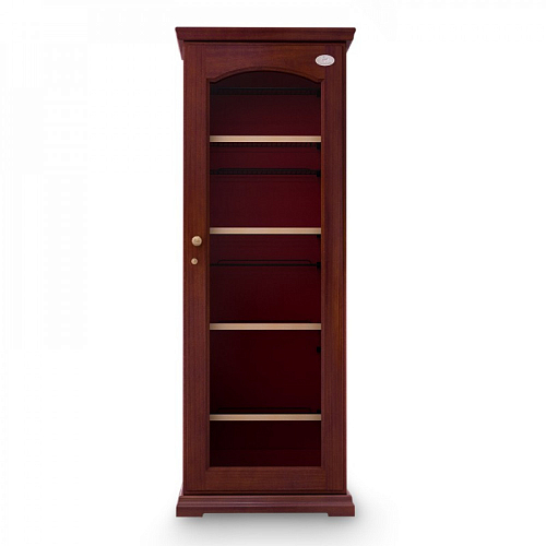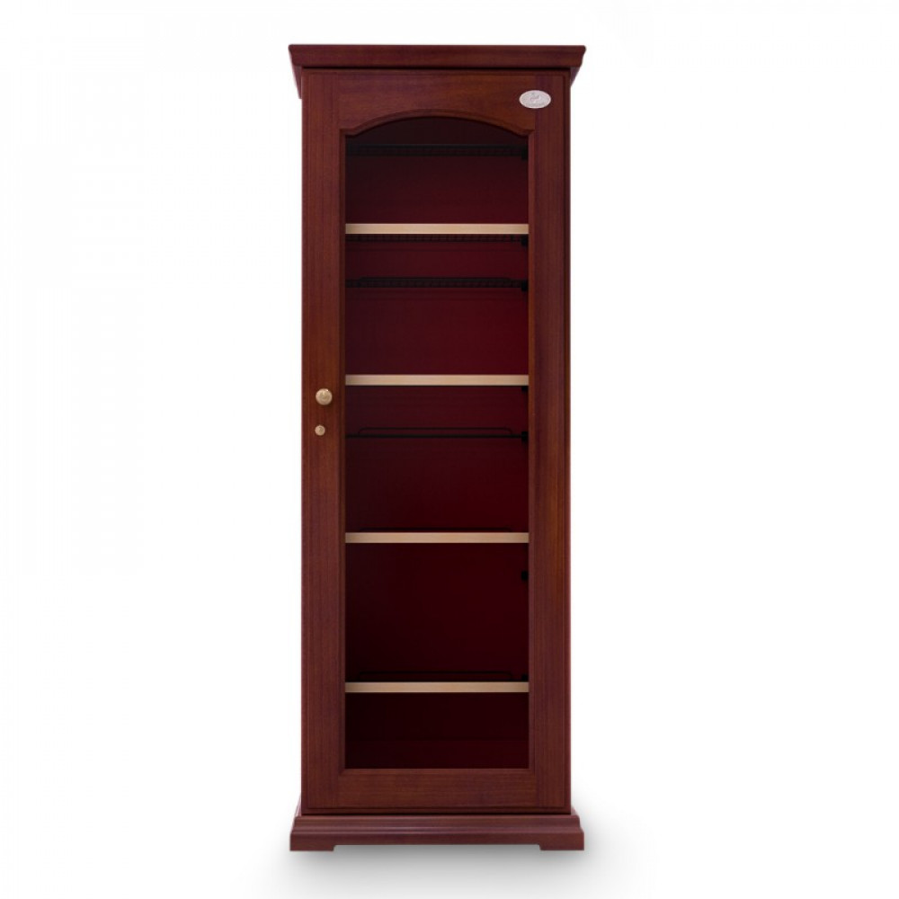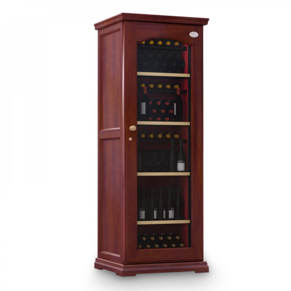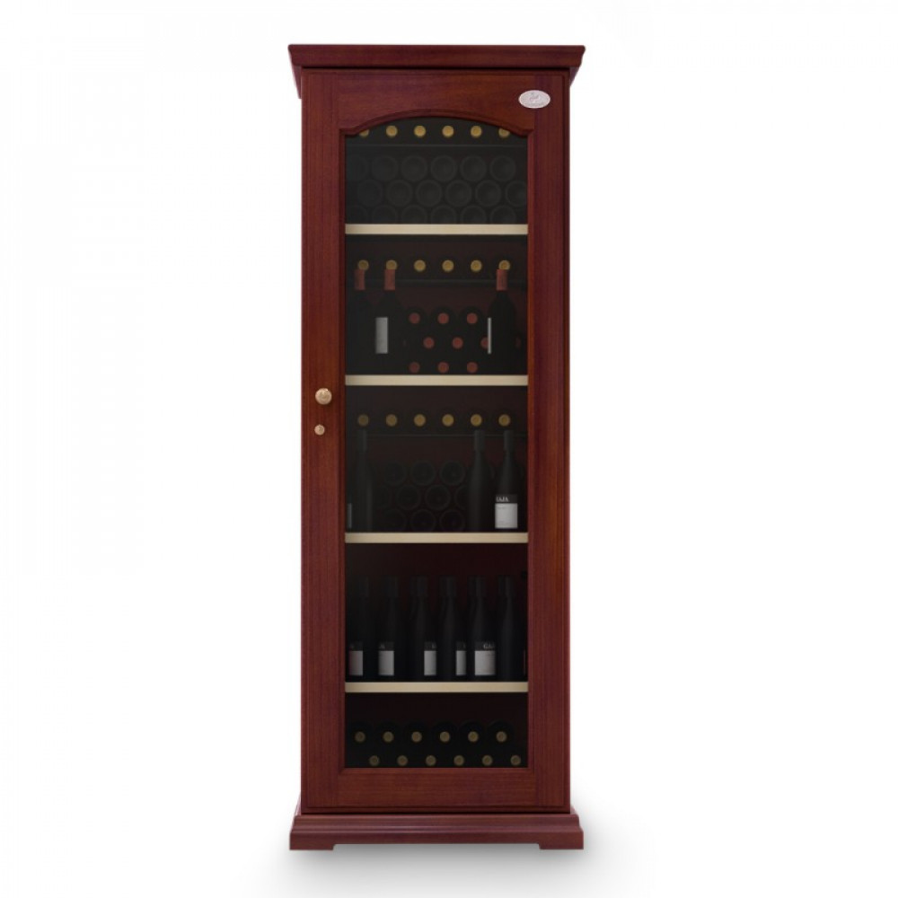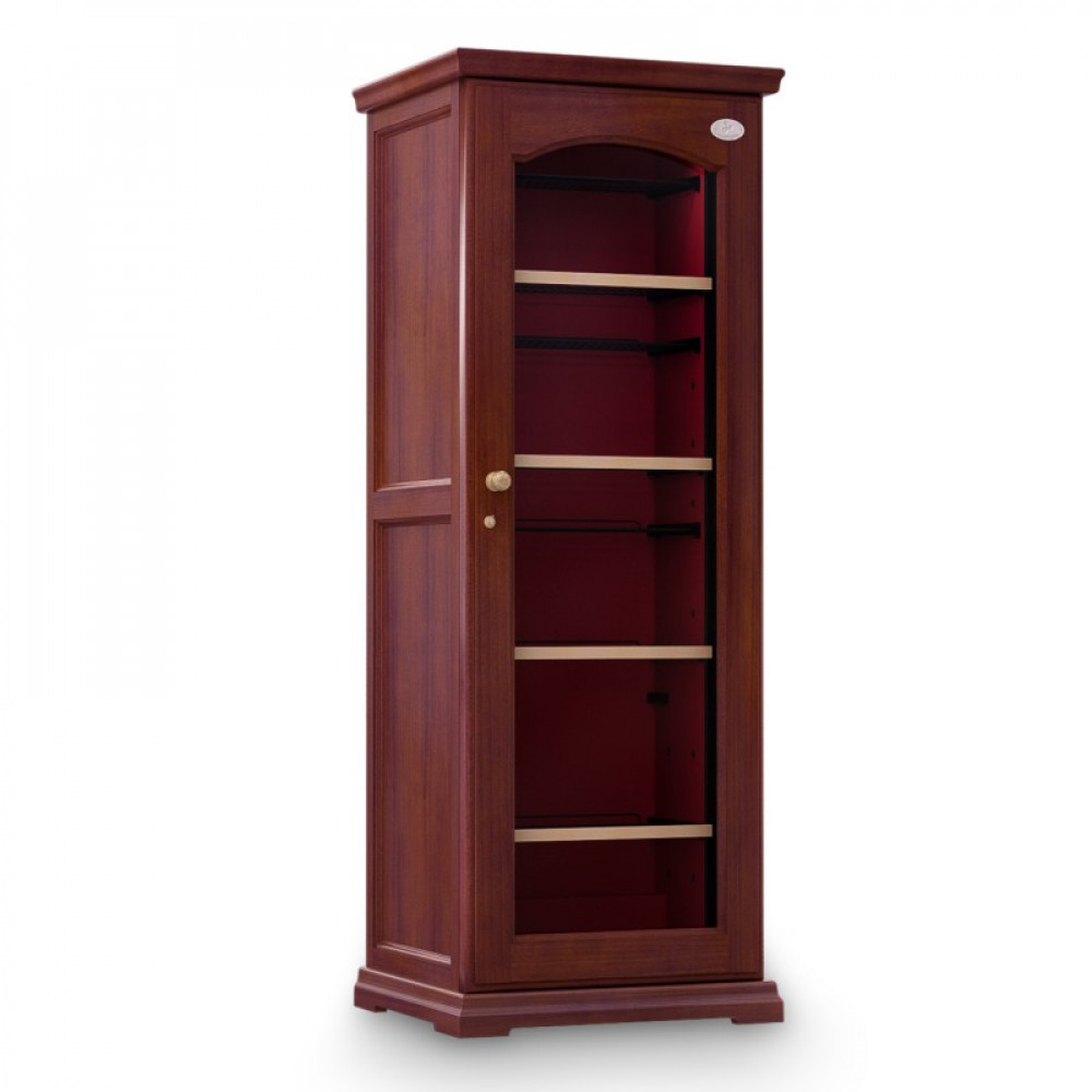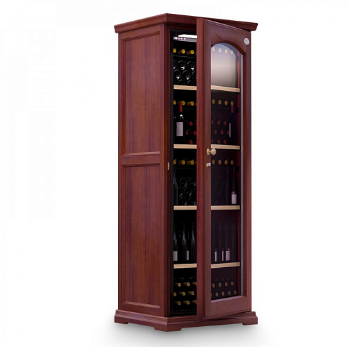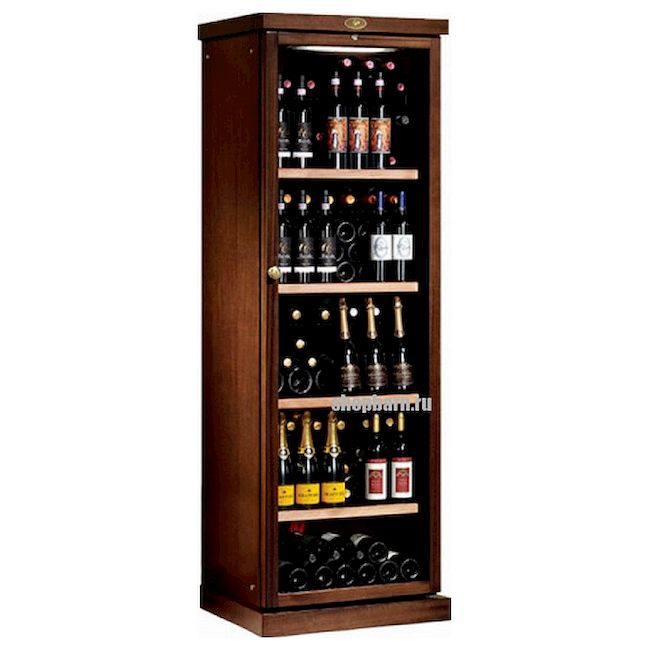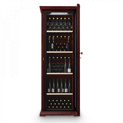 Модель оснащена электронным термостатом, цифровым дисплеем, подсветкой и замком. Корпус выполнен из крашенного металла, встроенного в деревянный короб, дверь - из двойного стекла с защитой от ультрафиолетовых лучей, полки - из крашенного металла.