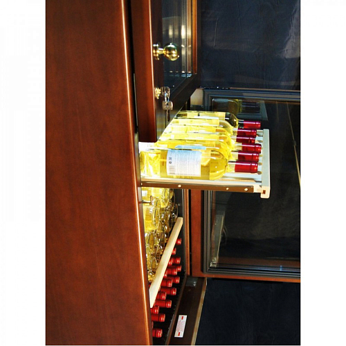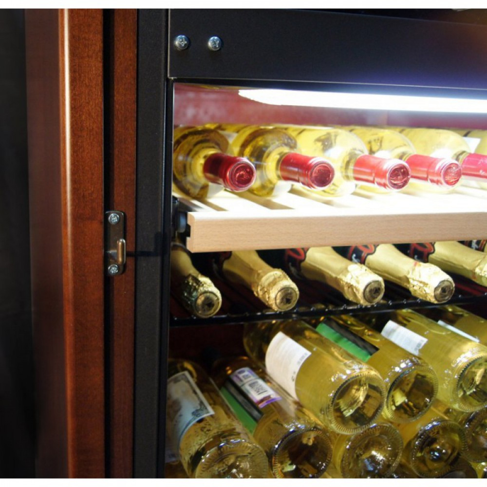 Двух дверная модель оснащена двойным защитным стеклом от УФ излучения, однотонная LED-подсветка подчёркивает стиль, встроенный замок в каждой зоне и классические ручки дверей, статическое охлаждение способствует понижать температуру вина и сохранить оптимальную влажность внутри камеры. Винный шкаф устанавливается как отдельно стоящий, материал корпуса металл окрашенный в тон деревянного короба в четырех цветовых гаммах (вишня, орех, дуб, венге).