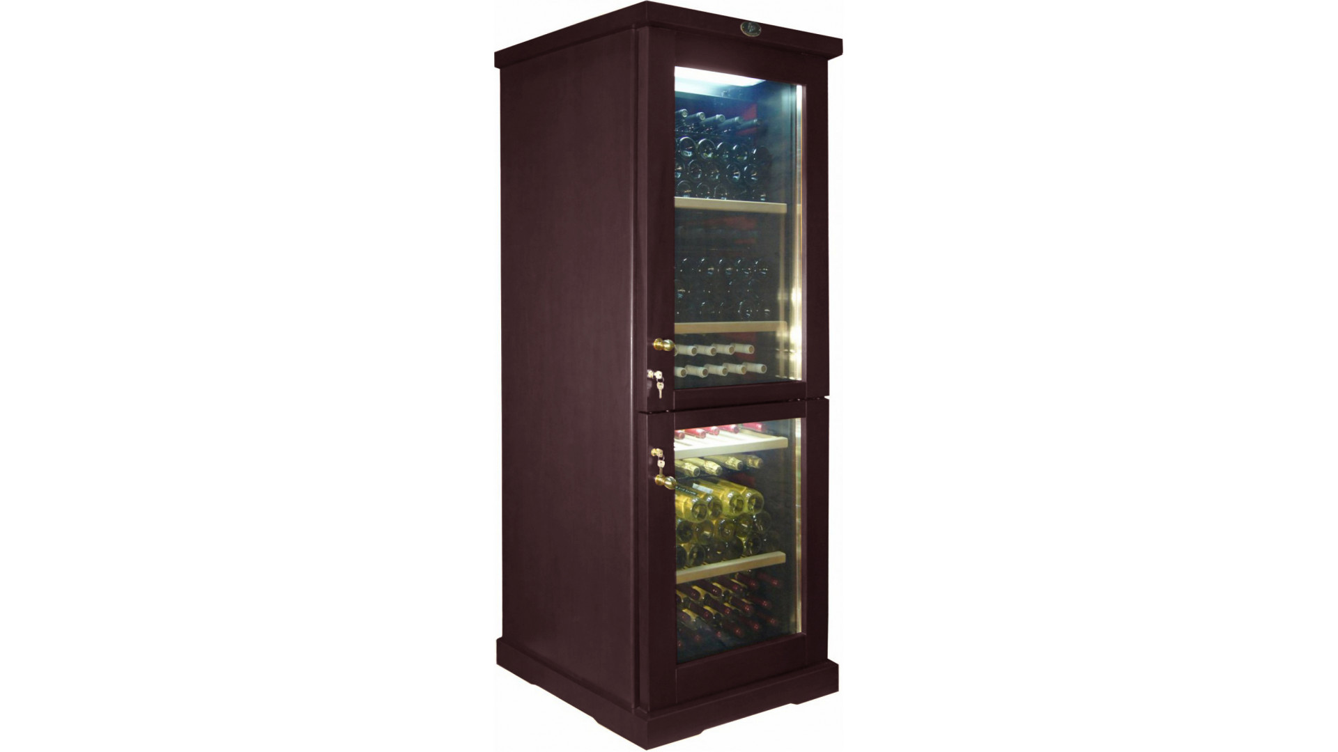 Модель оснащена электронным термостатом, цифровым дисплеем, подсветкой и замком. Корпус выполнен из крашенного металла, встроенного в деревянный короб, двери - из двойного стекла с защитой от ультрафиолетовых лучей, полки - из крашенного металла.