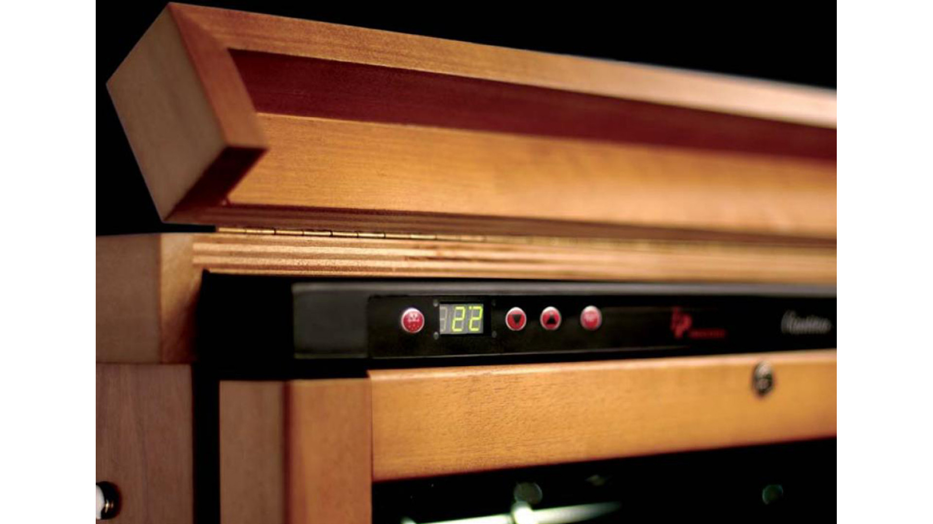 Модель оснащена электронным термостатом, цифровым дисплеем, подсветкой и замком. Корпус выполнен из крашенного металла, встроенного в деревянный короб Risto Line (древесина меньше по плотности и толщине, чем у моделей CEX), дверь - из двойного стекла с защитой от ультрафиолетовых лучей, полки - из крашенного металла.