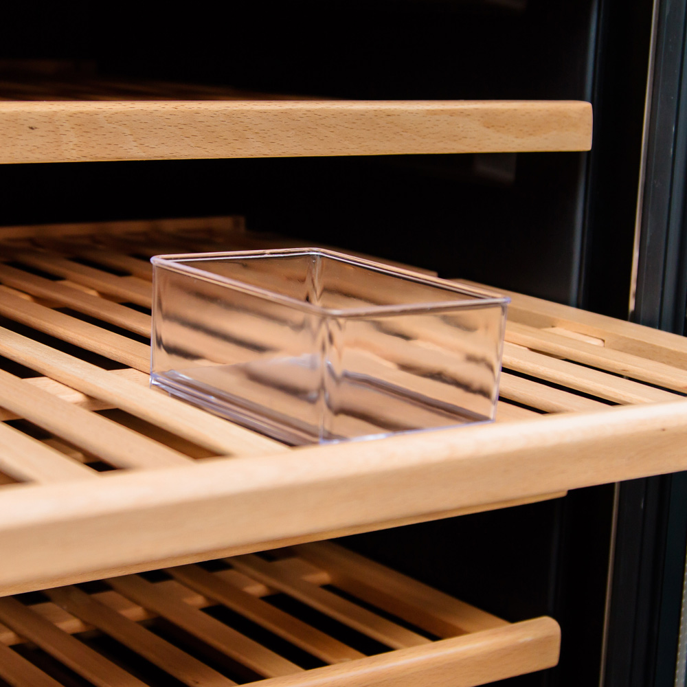 Модель оснащена электронным термостатом, цифровым дисплеем, подсветкой и замком. Корпус выполнен из крашенного металла, дверь - из рамы из нержавеющей стали и двойного стекла с защитой от ультрафиолетовых лучей, полки - из дерева.