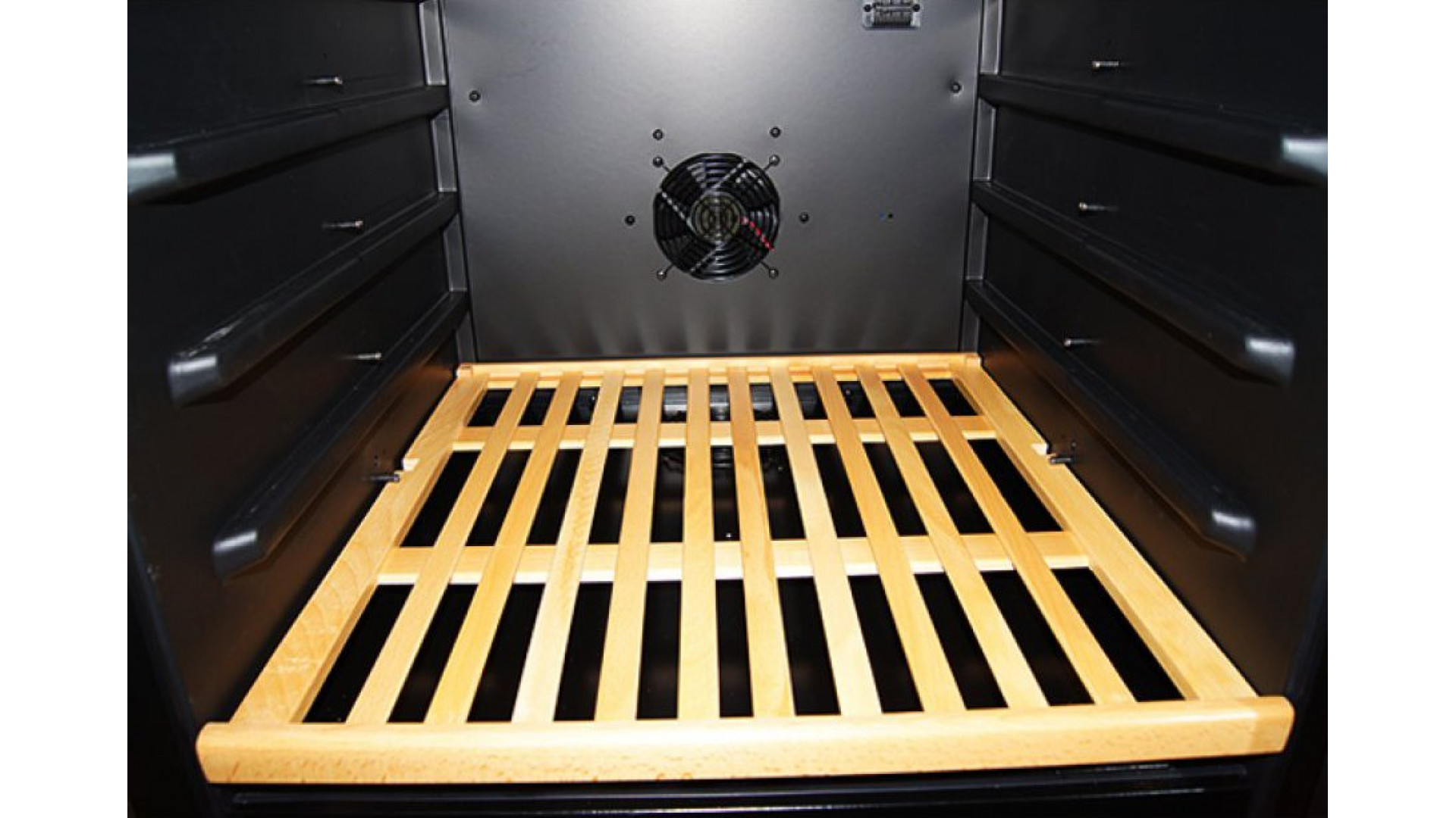 Модель оснащена электронным термостатом, цифровым дисплеем, подсветкой и замком. Корпус выполнен из крашенного металла, дверь - из двойного стекла с защитой от ультрафиолетовых лучей, окантовка верха и углов и полки - из дерева.