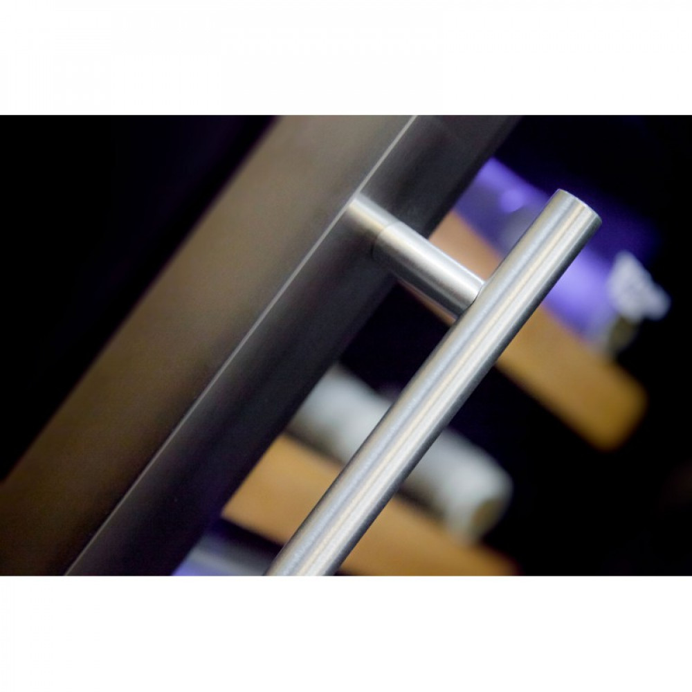 Электронная панель управления, светодиодное освещение в каждой зоне подчёркивает неповторимый стиль. Демонстрационная подсветка позволяет выбрать вино не открывая дверь, двойное защитное стекло от УФ излучения. Винный шкаф устанавливается как отдельн остоящий с соблюдением технических зазоров от 5 см с каждой стороны для естественного охлаждения, не рекомендуется устанавливать рядом с нагревательными приборами, батареями и прямыми солнечными лучами. Дверь выполнена в стальной раме чёрного цвета, ручка двери сталь, материал корпуса нержавеющая сталь.