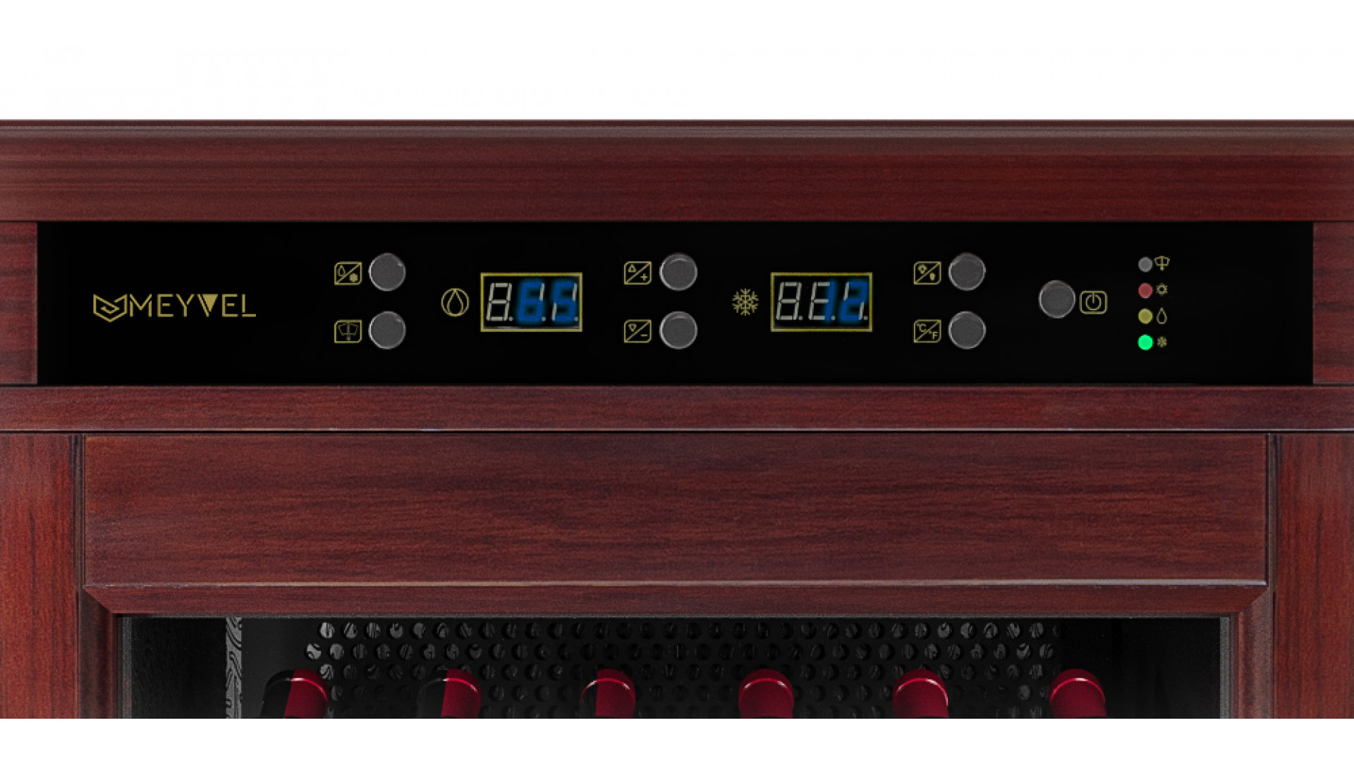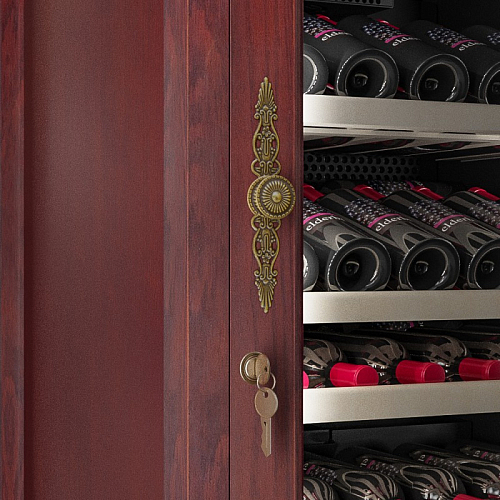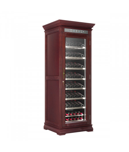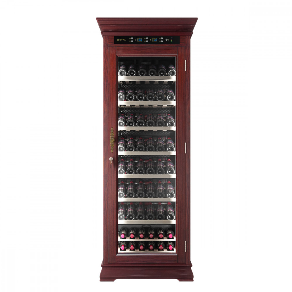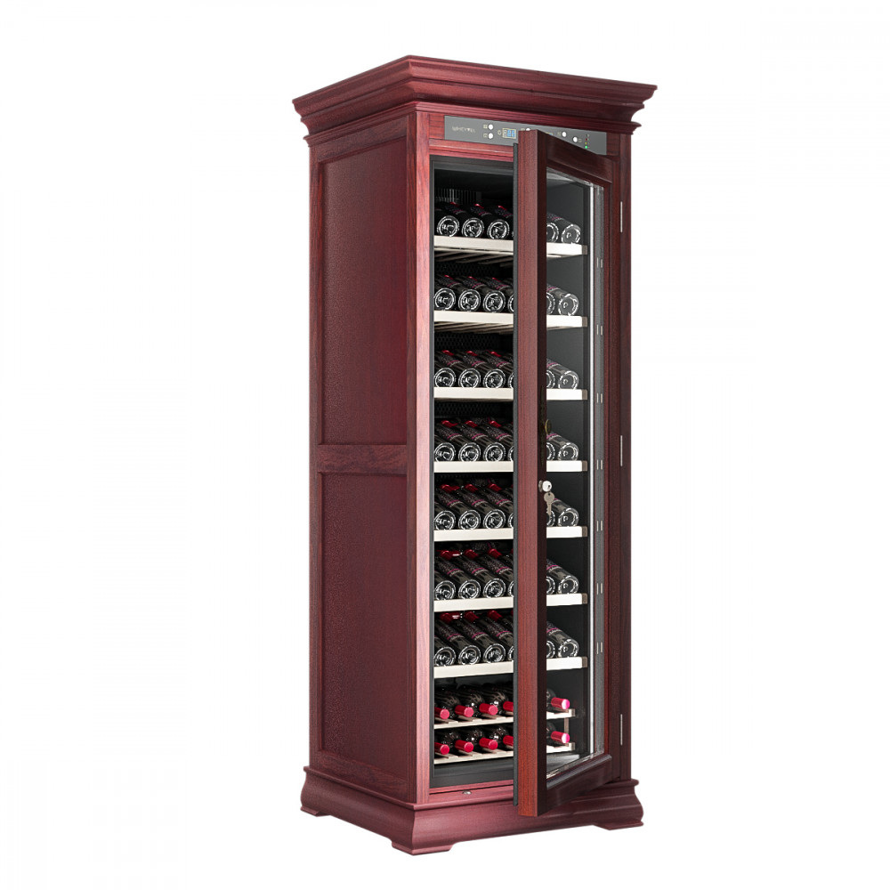 Шкаф винный Meyvel MV108-WM1-C предназначен для демонстрации, хранения и создания оптимальных условий для сохранения всех вкусовых свойств вина в бутылках на предприятиях общественного питания, торговли, в барах, ресторанах, специализированных магазинах, частных домах или квартирах. Модель оснащена сенсорной панелью управления, электронным термостатом и светодиодной подсветкой. Корпус выполнен из обшитой красным американским дубом стали, дверь - из деревянной рамы и двойного стекла с защитой от ультрафиолетовых лучей, полки - из массива бука, ручка двери - из стали.