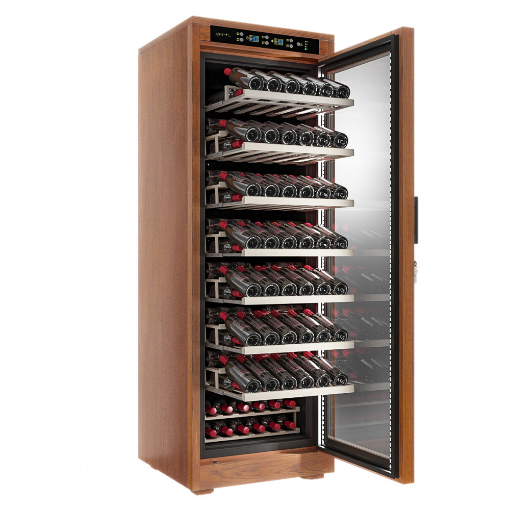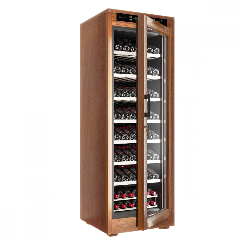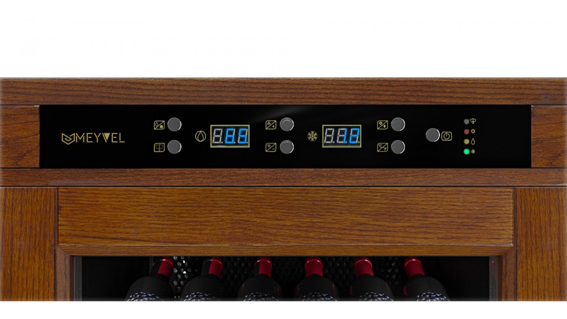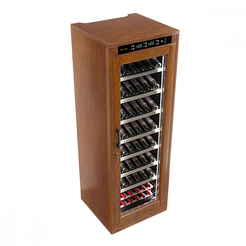 Шкаф винный Meyvel MV108-WN1-M предназначен для демонстрации, хранения и создания оптимальных условий для сохранения всех вкусовых свойств вина в бутылках на предприятиях общественного питания, торговли, в барах, ресторанах, специализированных магазинах, частных домах или квартирах. Модель оснащена сенсорной панелью управления, электронным термостатом и светодиодной подсветкой. Корпус выполнен из обшитой деревом стали, дверь - из деревянной рамы и двойного стекла с защитой от ультрафиолетовых лучей, полки - из массива бука, ручка двери - черного цвета.