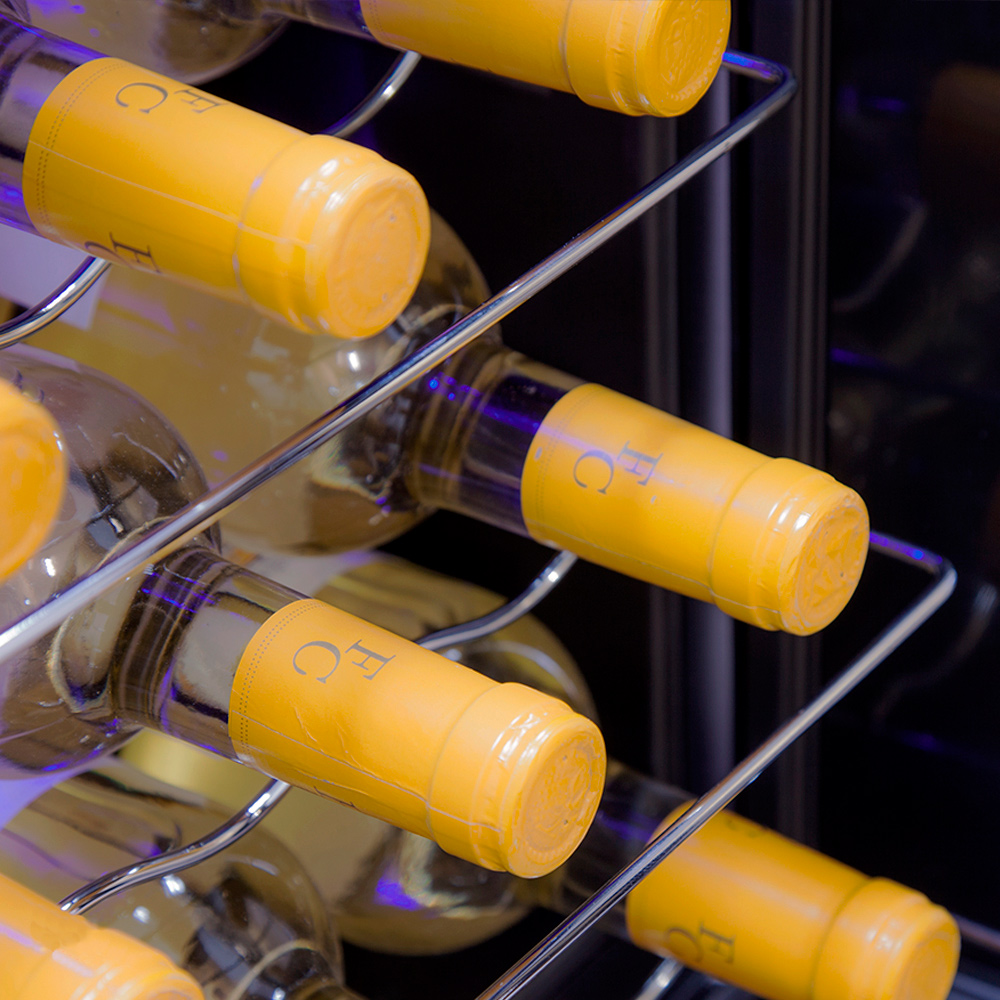 Корпус выполнен из окрашенной в черный цвет стали, дверь из нержавеющей стали и тонированного стекла с защитой от ультрафиолетовых лучей, полки из хромированного металла.