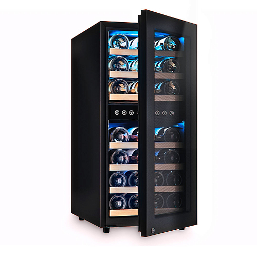 Шкаф винный Meyvel MV33-KBF2 предназначен для демонстрации, хранения и создания оптимальных условий для сохранения всех вкусовых свойств вина в бутылках на предприятиях общественного питания, торговли, в барах, ресторанах, специализированных магазинах, частных домах или квартирах. Модель оснащена сенсорной панелью управления, электронным термостатом и светодиодной подсветкой синего цвета в каждой зоне. Корпус выполнен из окрашенной в черный цвет стали, дверь - из пластиковой рамы и тонированного стекла с защитой от ультрафиолетовых лучей, полки - из массива бука.
