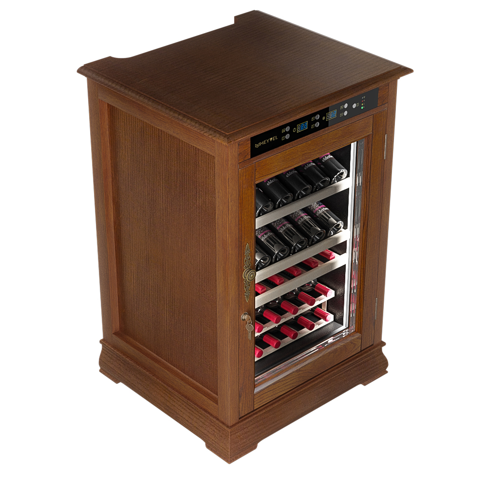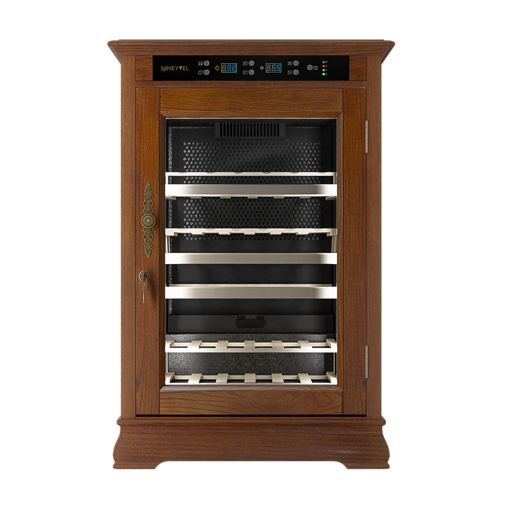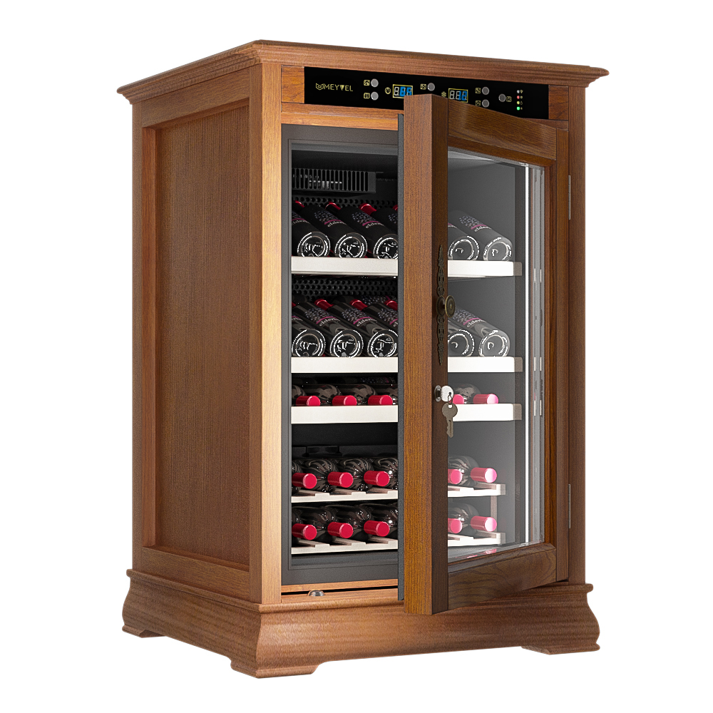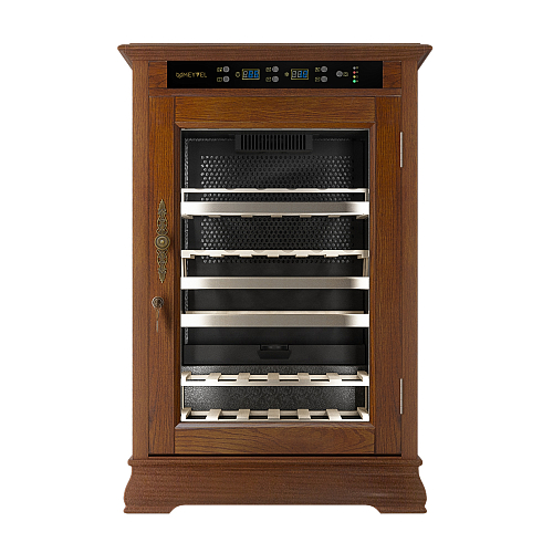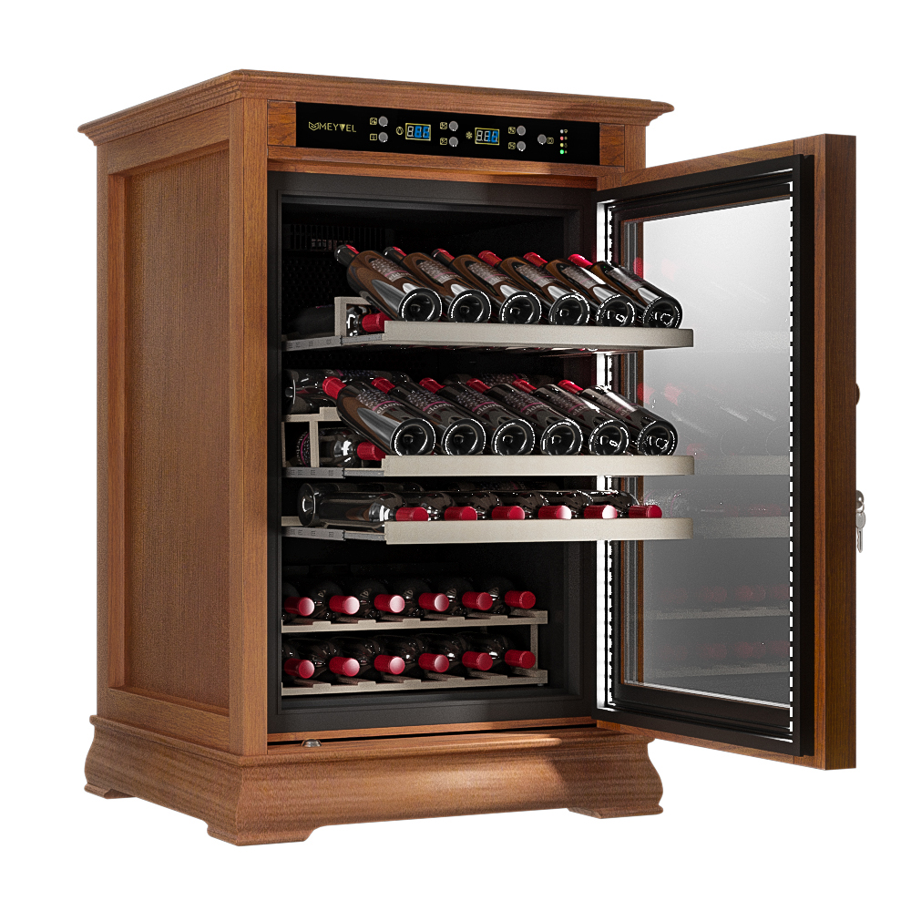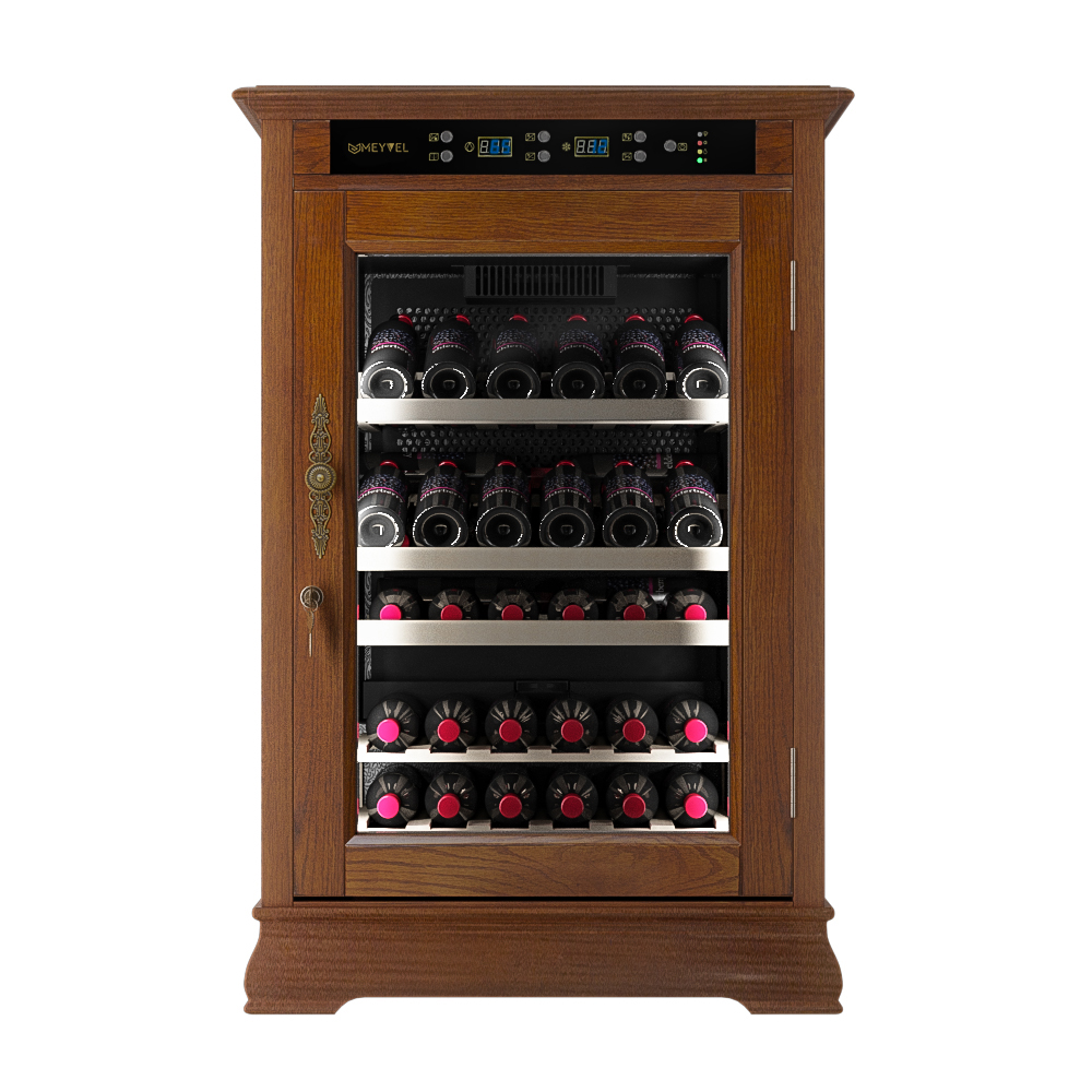 Шкаф винный Meyvel MV46-WN1-C предназначен для демонстрации, хранения и создания оптимальных условий для сохранения всех вкусовых свойств вина в бутылках на предприятиях общественного питания, торговли, в барах, ресторанах, специализированных магазинах, частных домах или квартирах. Модель оснащена сенсорной панелью управления, электронным термостатом и светодиодной подсветкой. Корпус выполнен из обшитой деревом стали, дверь - из деревянной рамы и двойного стекла с защитой от ультрафиолетовых лучей, полки - из массива бука.
