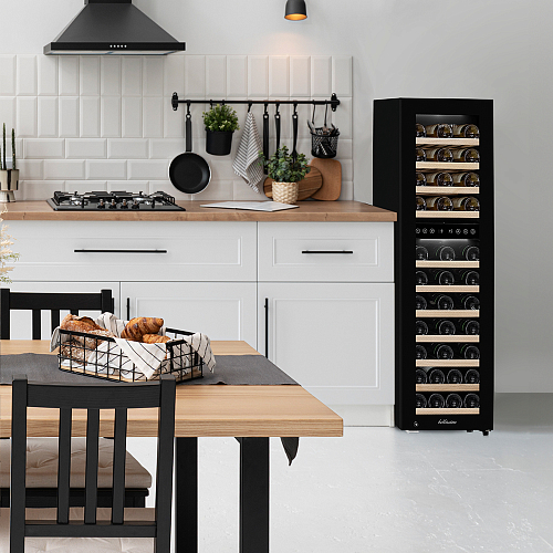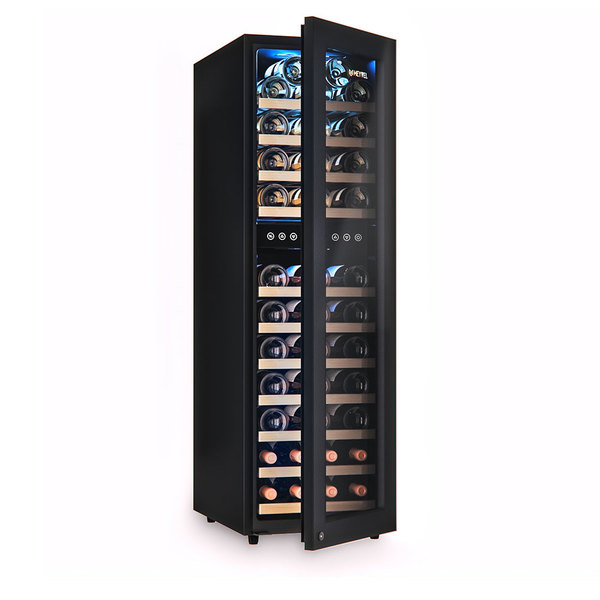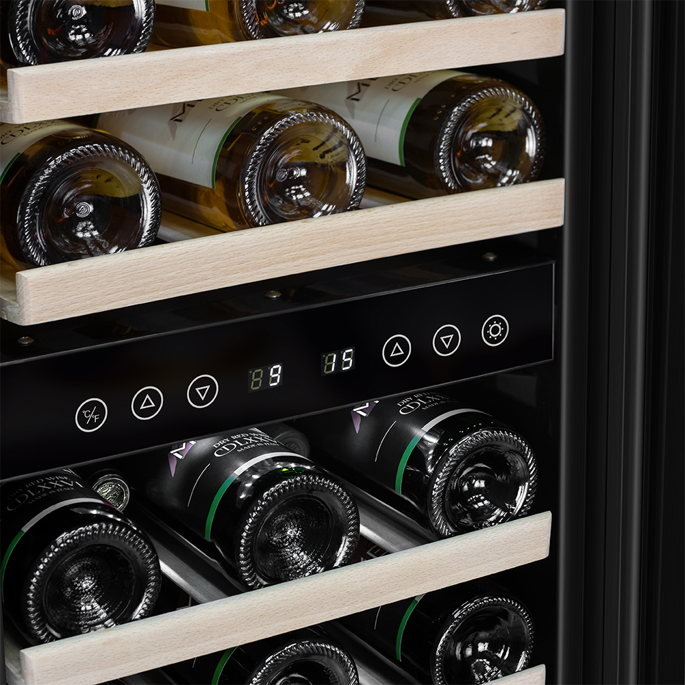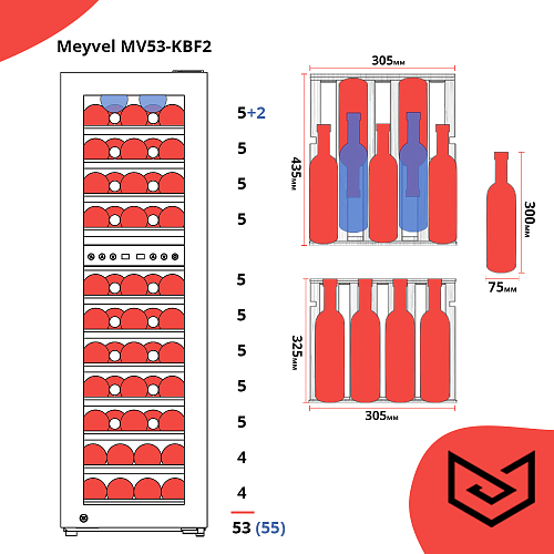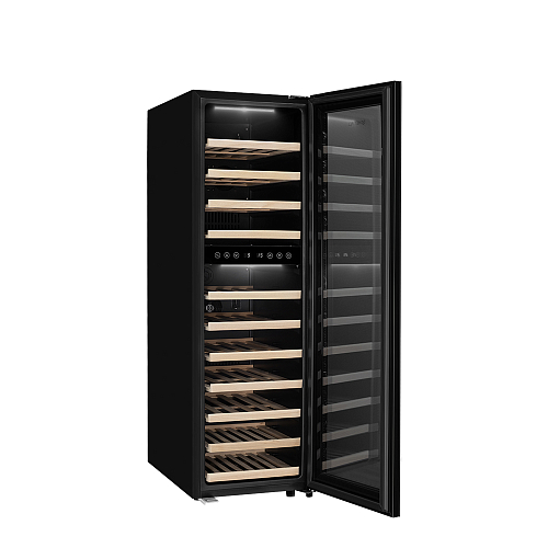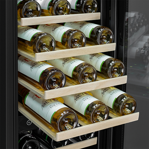 Шкаф винный Meyvel MV53-KBF2 предназначен для демонстрации, хранения и создания оптимальных условий для сохранения всех вкусовых свойств вина в бутылках на предприятиях общественного питания, торговли, в барах, ресторанах, специализированных магазинах, частных домах или квартирах. Модель оснащена сенсорной панелью управления, электронным термостатом и светодиодной подсветкой синего цвета в каждой зоне. Корпус выполнен из окрашенной в черный цвет стали, дверь - из черной рамы и тонированного стекла с защитой от ультрафиолетовых лучей, полки - из массива бука.
