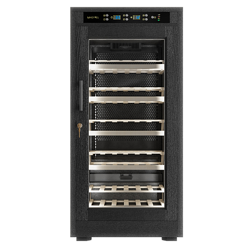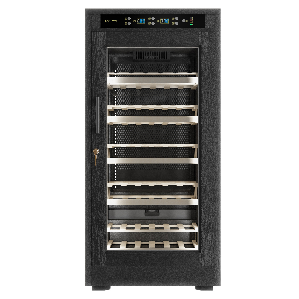 Шкаф винный Meyvel MV66-WB1-M предназначен для демонстрации, хранения и создания оптимальных условий для сохранения всех вкусовых свойств вина в бутылках на предприятиях общественного питания, торговли, в барах, ресторанах, специализированных магазинах, частных домах или квартирах. Модель оснащена сенсорной панелью управления, электронным термостатом и светодиодной подсветкой. Корпус выполнен из обшитой деревом стали, дверь - из деревянной рамы и двойного стекла с защитой от ультрафиолетовых лучей, полки - из массива бука, ручка двери - черного цвета.