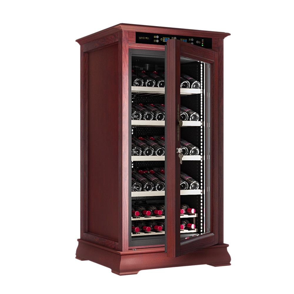Шкаф винный Meyvel MV66-WM1-C предназначен для демонстрации, хранения и создания оптимальных условий для сохранения всех вкусовых свойств вина в бутылках на предприятиях общественного питания, торговли, в барах, ресторанах, специализированных магазинах, частных домах или квартирах. Модель оснащена сенсорной панелью управления, электронным термостатом и светодиодной подсветкой. Корпус выполнен из обшитой красным американским дубом стали, дверь - из деревянной рамы и двойного стекла с защитой от ультрафиолетовых лучей, полки - из массива бука, ручка двери - из стали.