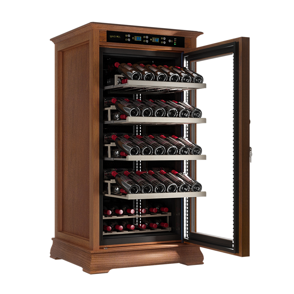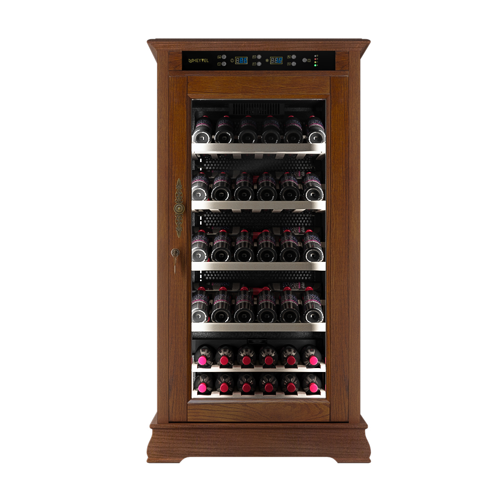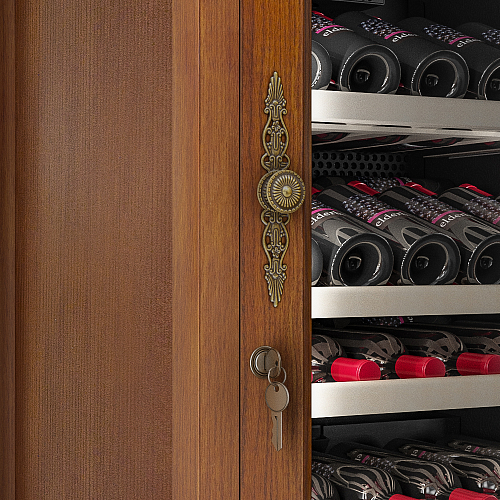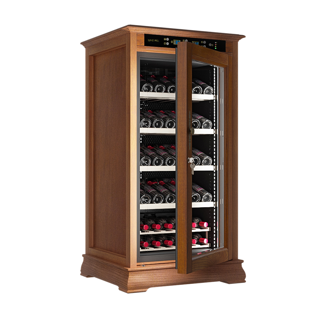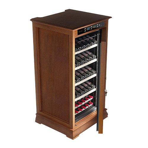Шкаф винный Meyvel MV66-WN1-C предназначен для демонстрации, хранения и создания оптимальных условий для сохранения всех вкусовых свойств вина в бутылках на предприятиях общественного питания, торговли, в барах, ресторанах, специализированных магазинах, частных домах или квартирах. Модель оснащена сенсорной панелью управления, электронным термостатом и светодиодной подсветкой. Корпус выполнен из обшитой деревом стали, дверь - из деревянной рамы и двойного стекла с защитой от ультрафиолетовых лучей, полки - из массива бука, ручка двери - из стали.