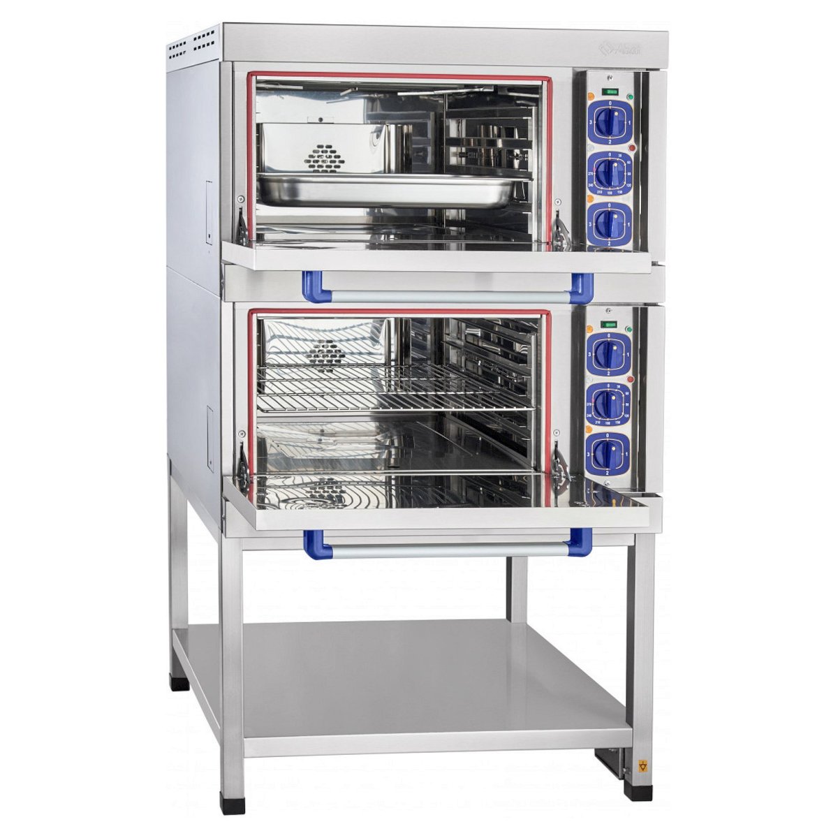 Каждая духовка имеет одну решетку 530х650мм и два противня GN1/1-65 размером 530х325х65мм, изготовленные из нержавеющего металла. Шкаф имеет раздельную регулировку мощности верхнего и нижнего блоков ТЭНов. Обладает возможностью принудительной конвекции и пароувлажнения. Все элементы конструкции изготовлены из нержавеющей стали.Подставка шкафа имеет полку и регулируемые по высоте ножки.
