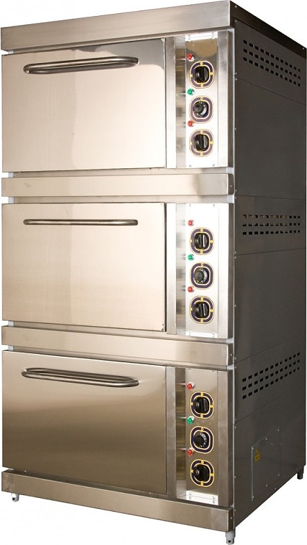 Шкаф жарочный Онега ШЖЭ-3 предназначен для выпечки хлебобулочных изделий и приготовления широкого ассортимента блюд на предприятиях пищевой промышленности, общественного питания и торговли. Модель оснащена 3 рабочими камерами с откидными дверьми с горизонтальными рукоятками и 3 электромеханическими панелями управления. Фронтальная облицовка корпуса выполнена из нержавеющей стали, боковины – из окрашенной стали, противни – из углеродистой стали.