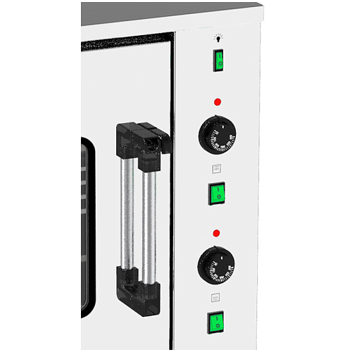 Двойное остекление дверок жарочного шкафа и лампы освещения камер шкафа позволяют, при закрытых дверках, визуально контролировать состояние приготавливаемых продуктов.