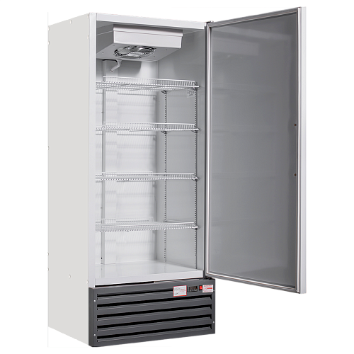 Оборудование имеет нижнее расположение холодильного агрегата, что позволяет с большим удобством выкладывать товары на нижнюю полку. Шкаф оснащен системой принудительного разгона воздуха.