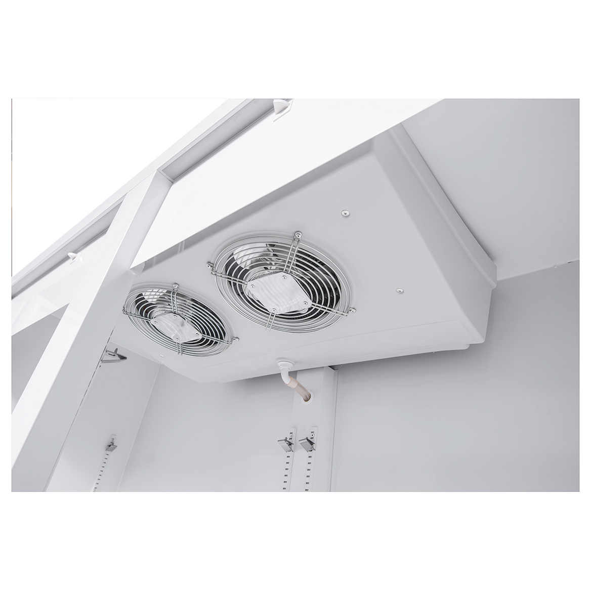 Оборудование имеет нижнее расположение холодильного агрегата, что позволяет с большим удобством выкладывать товары на нижнюю полку. Шкаф оснащен системой принудительного разгона воздуха.