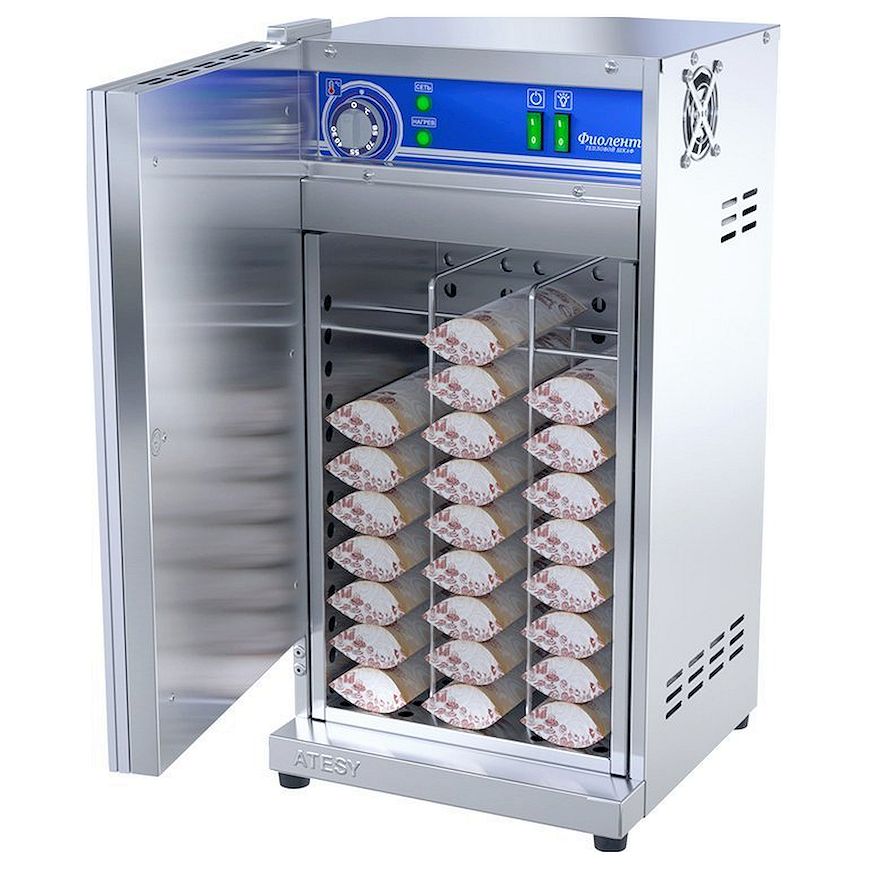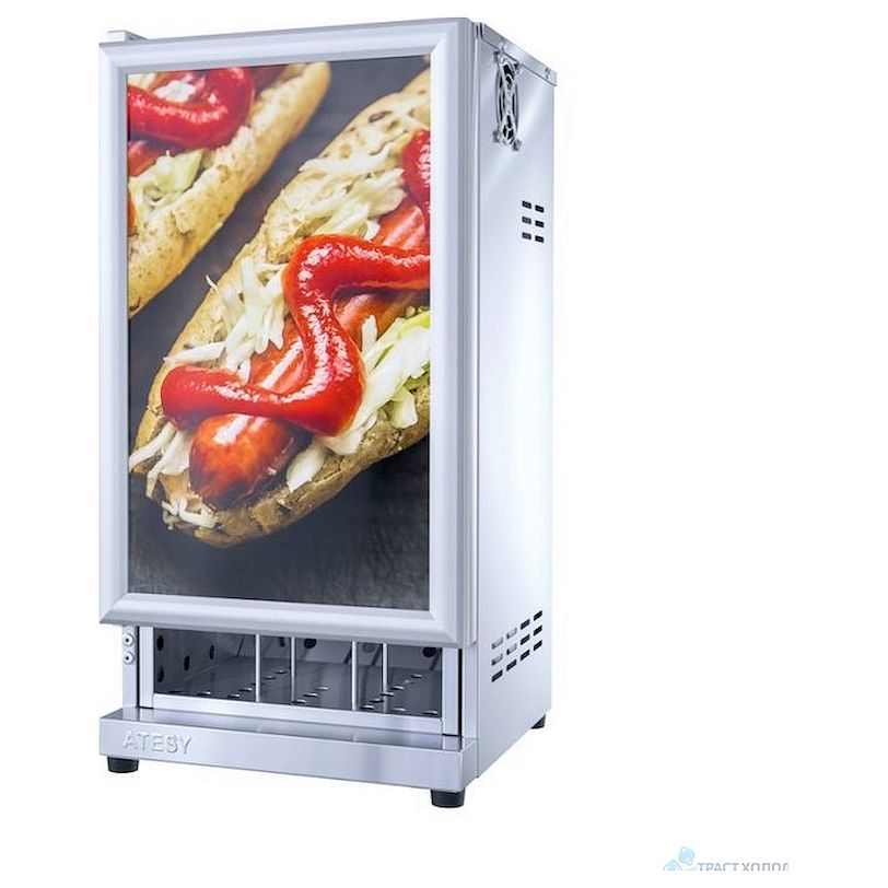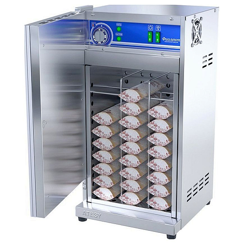 Шкаф тепловой Атеси ФИОЛЕНТ ШТХ-24-350.350-01 предназначен для непродолжительного хранения готовых упакованных хот-догов и пирожков в теплом состоянии. Шкаф тепловой для пирожков и хот-догов изготовлен из нержавеющей стали. Дверца шкафа оснащенасветовой панелью (лайтбоксом). Конструкция лайтбокса позволяет легко заменить в нем баннер. Дверца фиксируется на магните. Внутри шкафа расположена специальная кассета с направляющими для пирожков и хот-догов в упаковке. Кассета легко вынимается из шкафа для удобства санитарной обработки. Быстрый и равномерный прогрев внутреннего объема осуществляется с помощью конвекции теплого воздуха. Температура внутри регулируется терморегулятором.