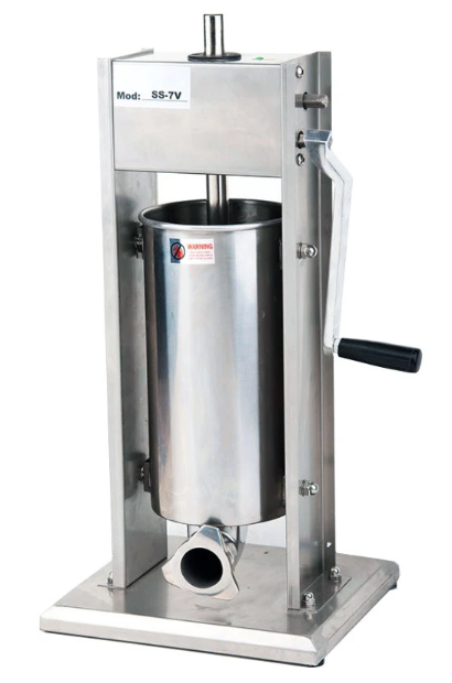 Ручной вертикальный шприц Gastrorag SS-7V предназначен для изготовления сосисок, колбас, купат, сарделек путём наполнения оболочки мясным фаршем на торговых точках, в колбасных цехах и в заведениях общественного питания (кафе, ресторанах). Этот шприц имеет объём 7 л и укомплектован четырьмя пластмассовыми насадками диаметром 10, 20, 30, 35 мм.