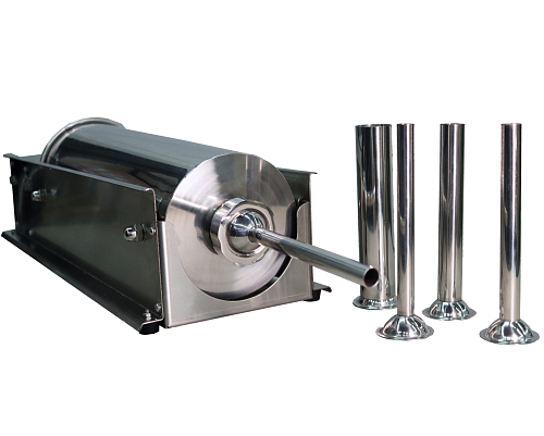 Шприц колбасный горизонтальный Rosso TG-7L предназначен для изготовления колбас, сосисок, сарделек, паштетов и другой продукции в оболочке из натуральных и искусственных материалов. Набор включает 4 насадки (наполнители) с диаметром 16,19,25 и 38мм, длиной 180 мм.