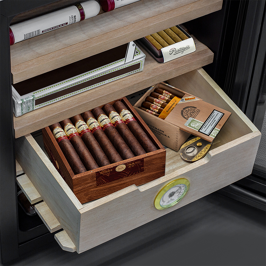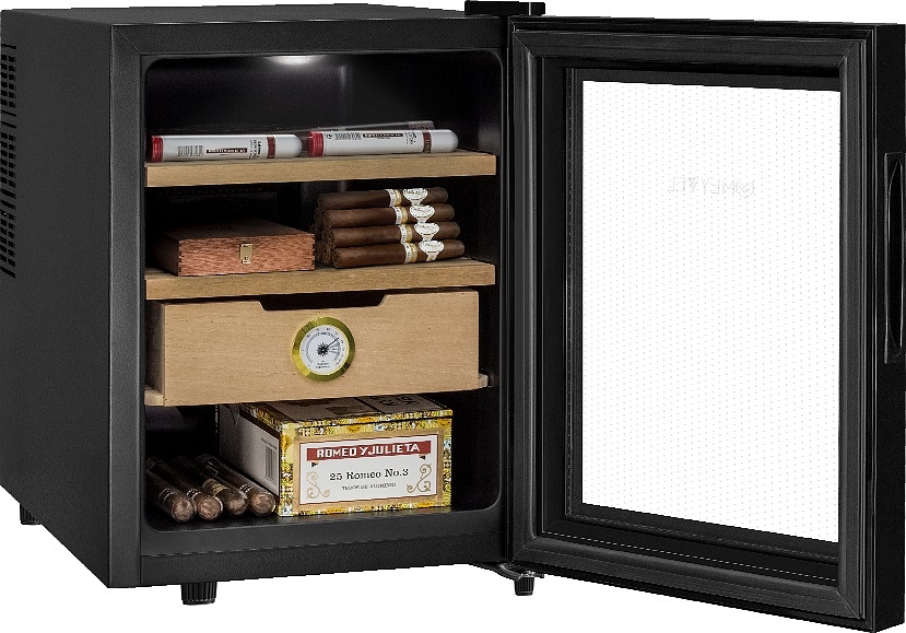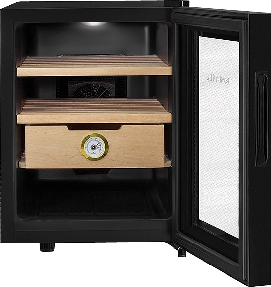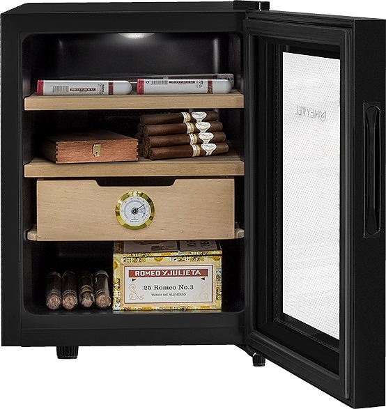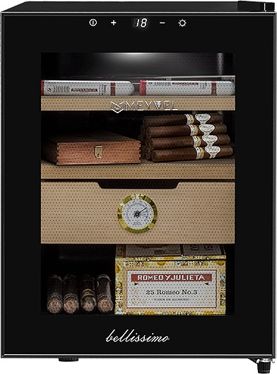 Сигарный шкаф MEYVEL MC-33BT предназначен для хранения в оптимальных условиях и демонстрации табачных изделий в специализированных магазинах, гостиницах, складских помещениях, а также домашних условиях.Модель оснащена распашной дверью на внешних петлях и сенсорной панелью управления с цифровым дисплеем. Копрус выполнен из стали с антикоррозийным покрытием черного цвета, рама двери – из черного пластика, полки и ящик – из массива древесины испанского кедра.