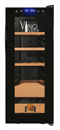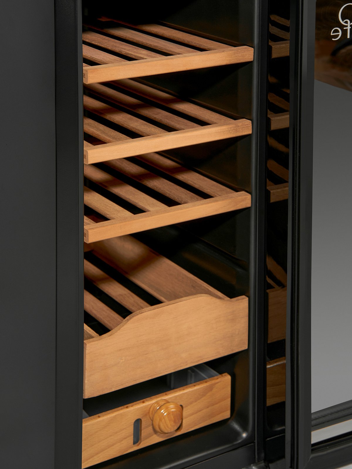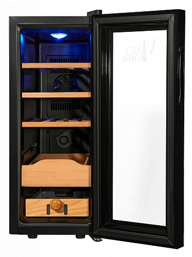 Сигарный шкаф Vinosafe VSCC225AM предназначен для демонстрации и хранения при оптимальных условиях и демонстрации табачных изделий в специализированных магазинах, гостиницах, складских помещениях, а также домашних условиях. Модель оснащена холодильной камерой с правосторонней перенавешиваемой распашной дверью на внешних петлях, обзорным остеклением, кабелем питания с вилкой, расположенной в верхней части фронта панелью управления с сенсорными клавишами и 2 светодиодными цифровыми дисплеями индикации. Копрус выполнен из стали с антикоррозийным покрытием черного цвета, полки и ящики – из массива древесины светлых пород.