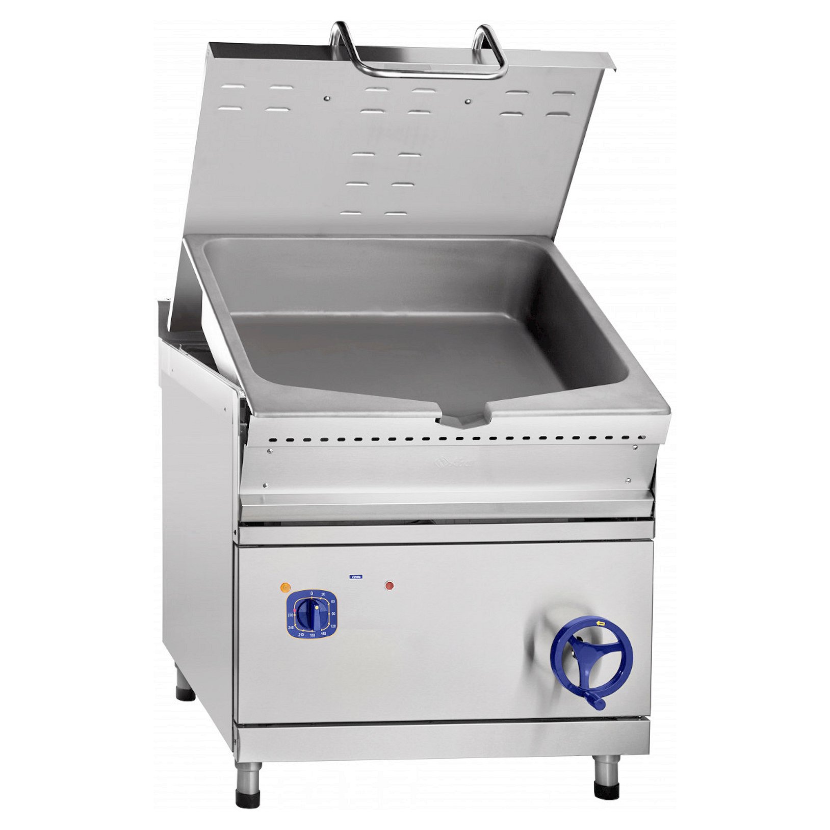 В сковороде реализован механизм подъема и опускания чаши. Этот фактор обеспечивает удобство обслуживания сковороды и простоту ее очистки после использования. Крышка фиксируется в любом положении и предотвращает потерю тепла. Ножки сковороды регулируются по высоте.