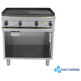 Благодаря использованию такой жарочной поверхности можно готовить аппетитные блюда из полуфабрикатов. Оптимальную для приготовления блюд температуру обеспечивает такой тип нагревательного элемента, как тэн. Предусмотренное количество рабочих поверхностей – 1. Дополнительное преимущество заключается в том, что поверхность прогревается абсолютно равномерно, что позволяет избежать пригорания и гарантирует отменные вкусовые качества блюд. Жарочная поверхность сковороды открытой EZ-T87/P-L KOVINASTROJ комбинированная. С помощью термостата можно регулировать температуру жарочной поверхности от 50 до 300°C.  По периметру жарочной поверхности имеется бортик для предотвращения разбрызгивания жира и жиросборник.