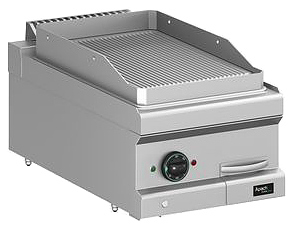 Модель с закругленными краями и бортами оснащена электромеханической панелью управления с терморегулятором и 2 световыми индикаторами и выдвижным лотком для сбора остатков пищи, масла и жира. Рабочая поверхность выполнена из конструкционной стали.