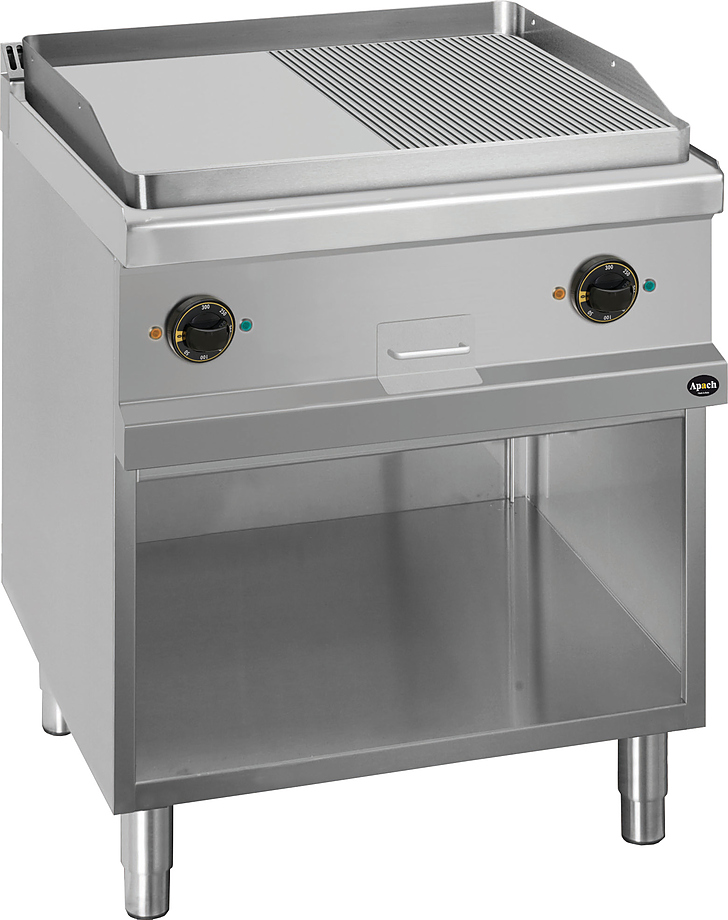 Модель с закругленными краями и бортами оснащена электромеханической панелью управления с 2 терморегуляторами и 4 световыми индикаторами, выдвижным лотком для сбора остатков пищи, масла и жира и открытой подставкой с регулируемыми по высоте ножками.