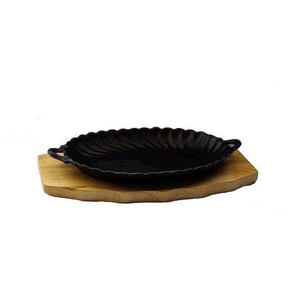 Чугунная сковорода на деревян. подставке, с волнистыми приподнятыми краями и ручками, длина 25 см, ширина 17 см