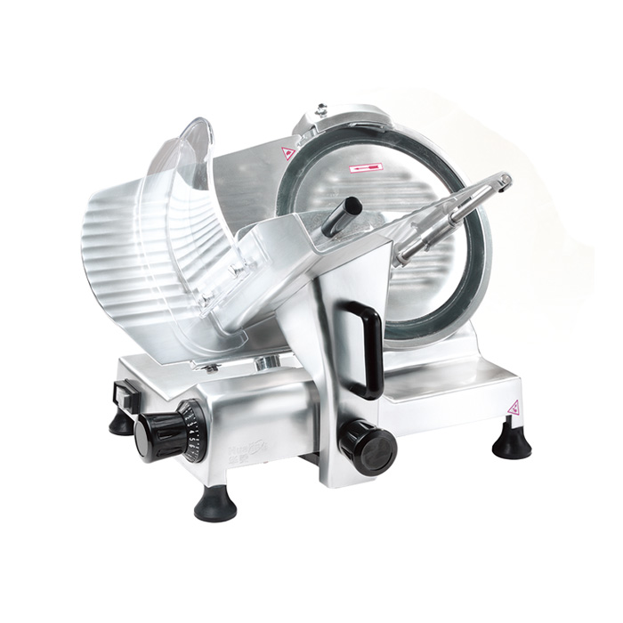 Слайсер GASTRORAG HBS-300 предназначена для нарезки гастрономических продуктов ломтиками различной толщины на предприятиях общественного питания, в супермаркетах и производственных цехах. Слайсер относится к гравитационному типу: нож, щиток и каретка наклонены под углом 45о, и за счет этого продукт перемещается под нож в значительной степени под собственным весом. Машина для нарезки гастрономических продуктов оснащена ножом диаметром 300 мм из нержавеющей стали. Для поддержания остроты лезвия предусмотрено встроенное затачивающее устройство. Перемещение каретки осуществляется вручную, для подачи продуктов к вращающемуся ножу предусмотрен специальный зажим. Этот зажим и защитное кольцо вокруг лезвия ножа обеспечивают безопасность оператора при работе с оборудованием. Толщина нарезки регулируется в пределах от 0.2 до 15 мм. Корпус ломтерезки изготовлен из алюминиево-магниевого сплава.