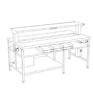 Фасовочный стол Mini T Модуль А с верхней П-образной полкой, подогреваемой столешницей, нишей под гастроемкости, лотками под упаковку.
