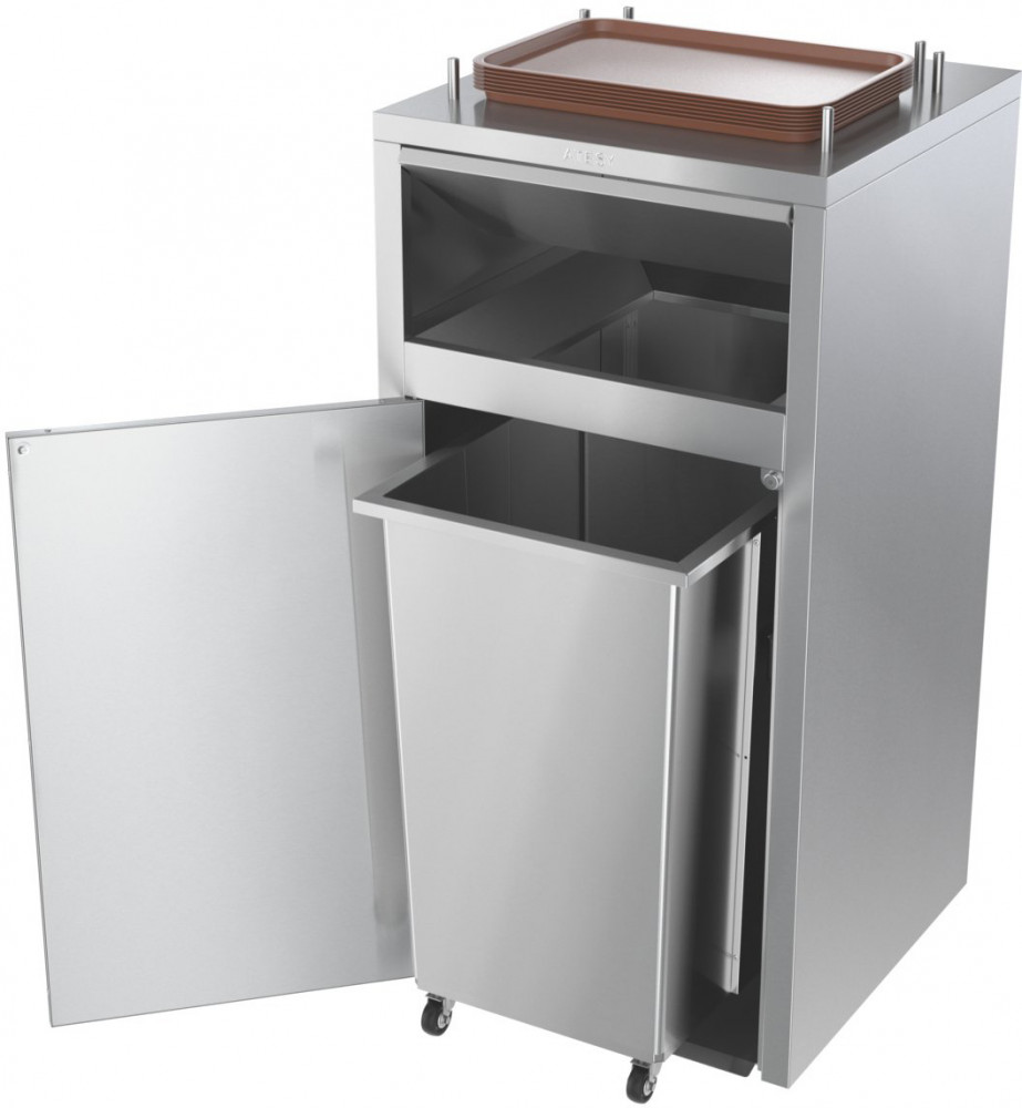 Станция сбора отходов Atesy ССО-240-01 используется для сбора одноразовой посуды и упаковки от фаст-фуда, а так же временного хранения использованных подносов в точках общественного питания и ресторанах самообслуживания.