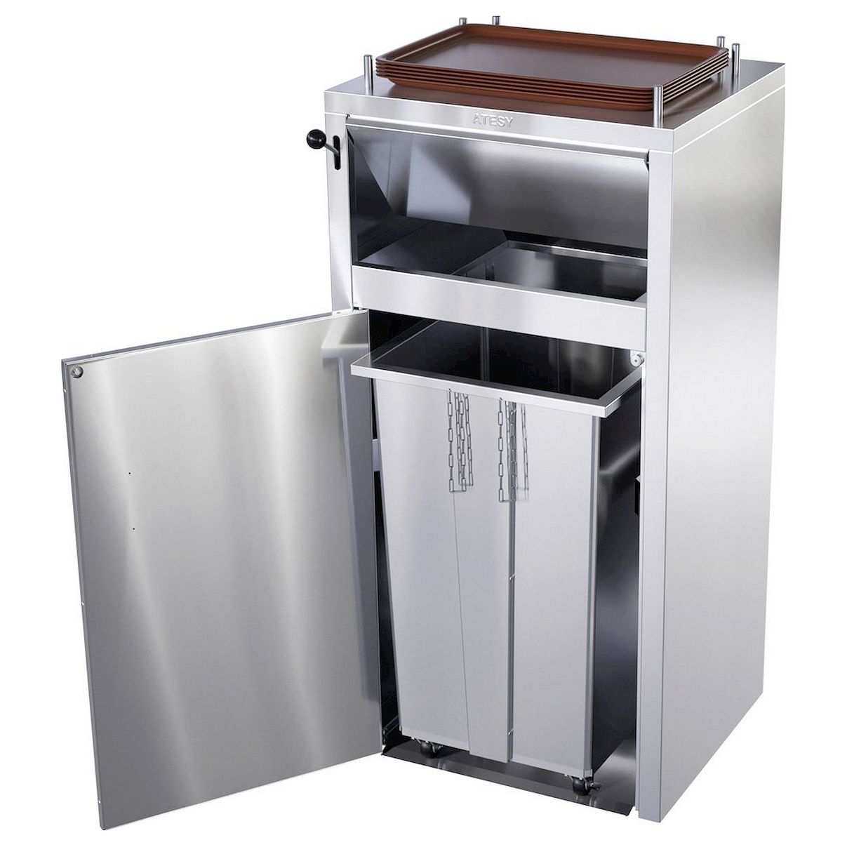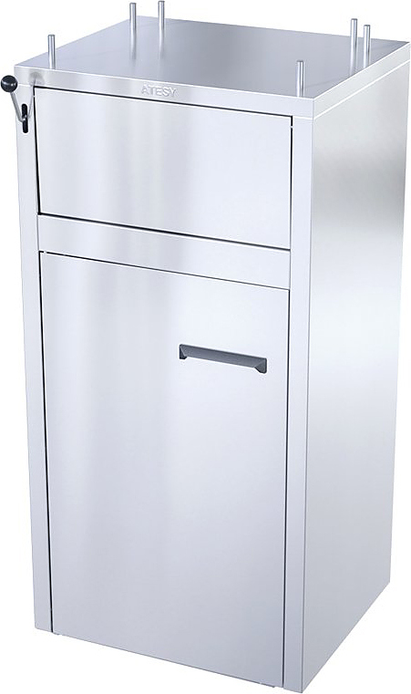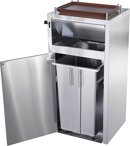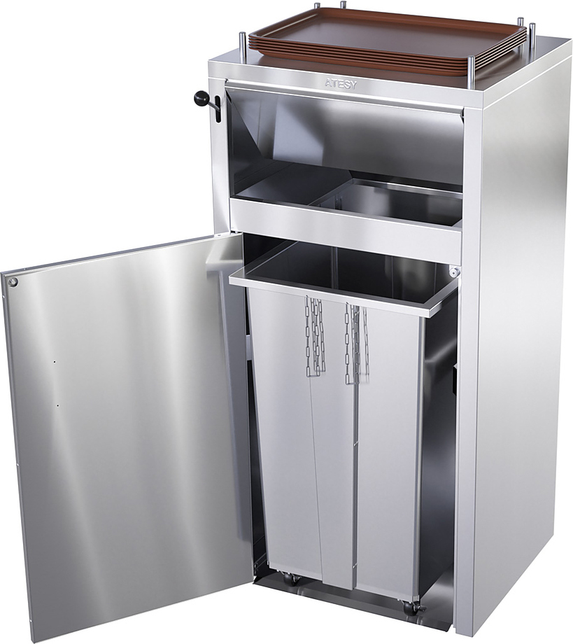 Станция сбора отходов Atesy ССО-180-Р-01 предназначен для сбора мусора, одноразовой посуды и других отходов в фастфудах. Изделие состоит из тумбы и служащей мусороприемником внутренней емкости на колесах, используемой совместно с мешком для мусора. Тумба станции и емкость для мусора изготавливаются из шлифованной легированной стали.