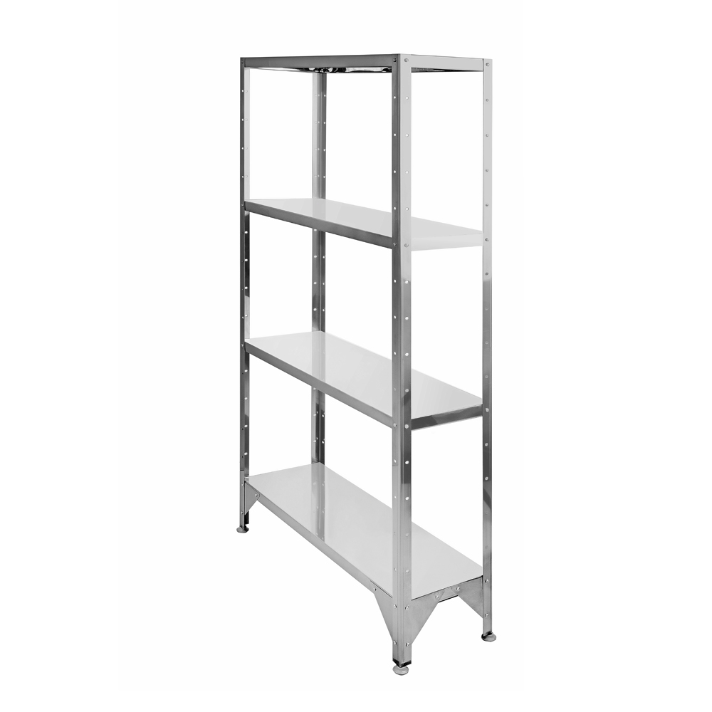 Стеллаж состоит их четырех сплошных полок и четырех стоек. Стойки стеллажа изготавливаются из оцинкованной/крашенной/нержавеющей стали. Полки выполнены из пищевой нержавеющей стали, усилены ребром жесткости и могут устанавливаться на разной высоте с шагом 96 мм, в зависимости от назначения их использования. Все кромки полок имеют подгиб (плющение), что полностью исключает возможность получения травмы персоналом при сборке, эксплуатации и санитарной обработке стеллажа. Стойки стеллажа регулируются по высоте, что позволяет при установке устранить неровности пола.