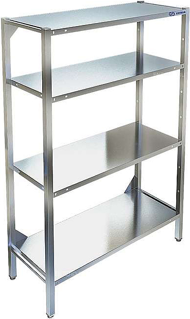 Стеллаж кухонный KAYMAN СК-221/1504 из нержавеющей стали AISI 430 (труба 40х40), полки сплошные из нержавеющей стали AISI 430. Используется в кухонных цехах для хранения сухих видов продуктов и кухонного инвентаря. Стеллаж имеет разборную конструкцию и состоит из четырёх стоек и четырёх полок. Стойки изготовлены из нержавеющей трубы 40х40. Полки сплошные изготовлены из нержавеющей стали AISI430 толщиной 0,8мм , могут крепиться на требуемой высоте - шаг 100 мм. Ножки стеллажа снабжены регуляторами высоты, что позволяет устранять неровности пола и дополнительные конструктивные элементы, предназначенные для предотвращения его раскачивания во время работы и придающие большую устойчивость. Универсальная конструкция позволяет легко производить сборку стеллажей. Нагрузка на каждую полку не более 150кг, при этом не более 400 кг на весь стеллаж.