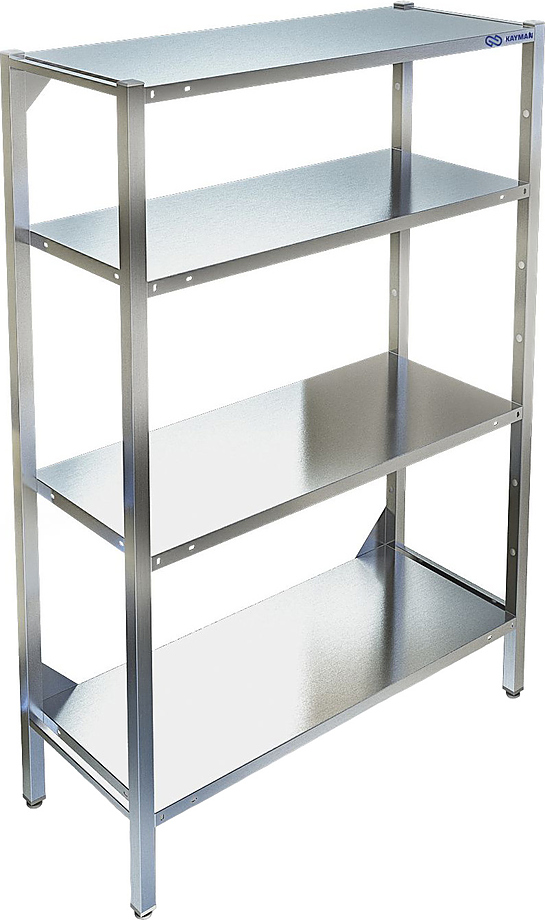 Стеллаж кухонный KAYMAN СК-241/0405 используется на предприятиях общественного питания и торговли, а также в промышленно-производственных заведениях для хранения различного оборудования, кухонных принадлежностей и сухих продуктов. Каркас выполнен из уголка 40х40 мм из нержавеющей стали AISI 430, полки - из нержавеющей стали AISI 430.