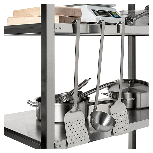Стеллаж кухонный разборный КОБОР СКТР-120/50 - выполнен из нержавеющей стали. Содержит 4 полки, расположенные каскадным образом. Разработанная на предприятии система крепления полок, обеспечивает жёсткость конструкции стеллажа. Каркас стеллажа состоит из ножек, выполненных из нержавеющей квадратной трубы 40х40 мм. Ножки стеллажа снабжены регуляторами высоты, позволяющими устранять возможные неровности пола. Опоры регуляторов высоты не подвержены коррозии. Стеллаж имеет разборную конструкцию, что является несомненным плюсом при транспортировке, монтаже и хранении.