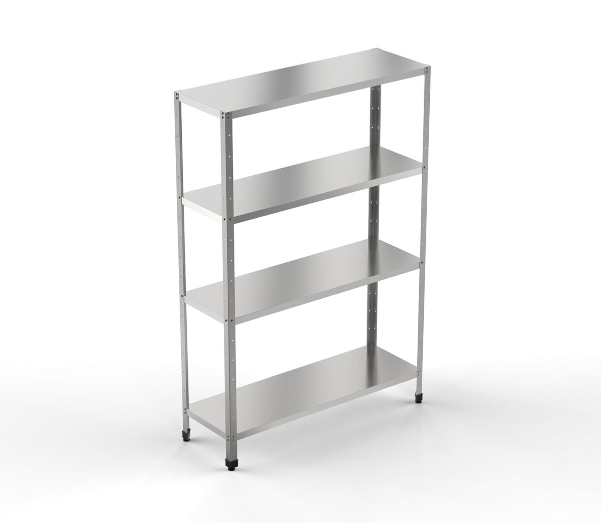 Стеллажи имеют высоту 1600 мм и оборудованы четырьмя полками. Стойки изготавливаются из оцинкованного уголка толщиной 1,5 мм, полки из нержавеющего металлического листа марки AISI 430 толщиной в 0,8 мм.