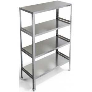 Стеллаж кухонный сборно-разборный оснащён 4 сплошными полками из нержавеющей стали AISI304, стойками из уголка 40х40мм из нержавеющей стали AISI430 толщиной стали 2мм. Нагрузка на каждую полку - не более 150кг. Стеллаж имеет разборную конструкцию и состоит из четырёх стоек и четырёх полок. Полки могут крепиться на требуемой высоте с шагом 50мм. Универсальная конструкция позволяет легко производить сборку. Ножки стеллажа снабжены регуляторами высоты, что позволяет устранять неровности пола. Дополнительные конструктивные элементы предотвращают раскачивание стеллажа во время работы и придают ему большую устойчивость. Стеллаж используется в кухонных цехах для хранения сухих видов продуктов и кухонного инвентаря.