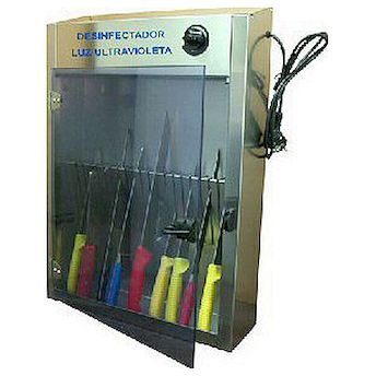 Прибор оборудован ультрафиолетовыми лампами, котрые выключаются при открытии прозрачной дверцы из поливинилхлорида с замком, и наклонным держателем. Ножи ставятся вертикально под углом для освещения лампами.
